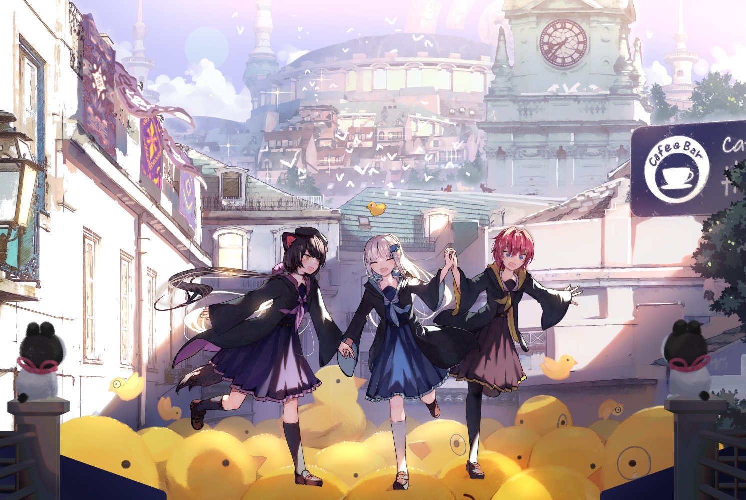 3girls :d :o ange_katrina animal_ears beret billboard bird black_hair black_headwear black_jacket black_socks black_thighhighs blue_eyes blue_hair blue_neckerchief blue_sailor_collar blue_sky blunt_bangs brown_footwear carpet cityscape clock clock_tower closed_eyes cloud coffee_mug crossed_bangs cup dog dog_ears dog_tail dome dress european_architecture hair_intakes hat holding_hands inamori_ryusa inui_toko jacket lamppost laughing lize_helesta lize_helesta_(4th_costume) loafers long_hair low_ponytail mug multicolored_hair multiple_girls neck_ribbon neckerchief nijisanji open_clothes open_jacket open_mouth outdoors parted_bangs pleated_dress ponytail purple_neckerchief purple_sailor_collar railing red_hair ribbon rooftop sailor_collar saucer sebastian_piyodore shoes short_hair sidelocks sky smile socks sparkle spire standing standing_on_another's_head standing_on_one_leg swept_bangs tail thighhighs too_many too_many_birds tower tree two-tone_hair very_long_hair virtual_youtuber white_hair white_socks window yellow_neckerchief yellow_sailor_collar