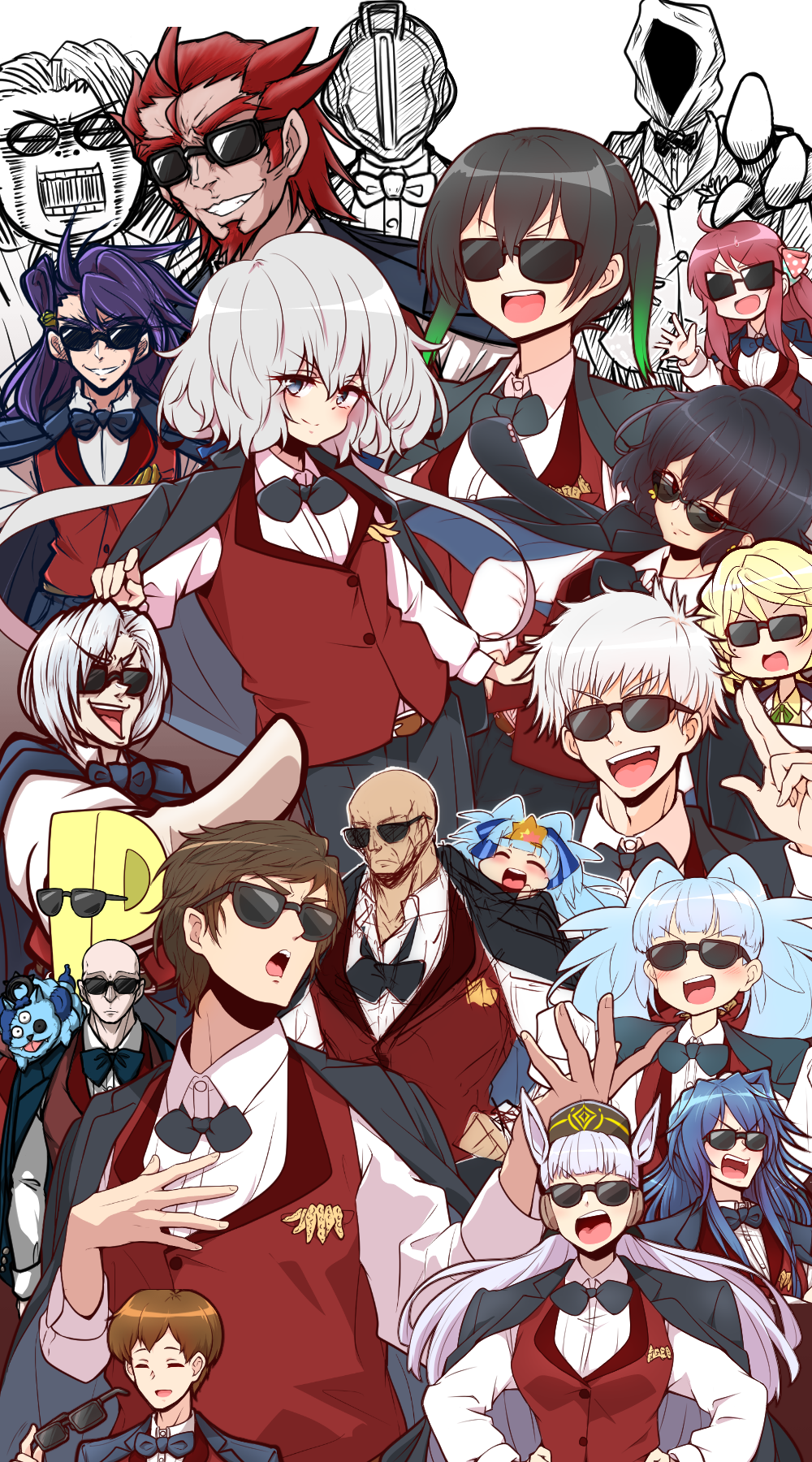 6+boys 6+girls arknights bald blonde_hair blue_hair bow bowtie brown_hair character_request clenched_teeth commentary_request copyright_request cosplay doctor_(arknights) go_takeo gojo_satoru highres hoshikawa_lily idolmaster jacket jacket_on_shoulders jujutsu_kaisen konno_junko long_hair looking_at_viewer love_live! love_live!_nijigasaki_high_school_idol_club minamoto_sakura mizuno_ai multicolored_hair multiple_boys multiple_girls open_mouth producer_(idolmaster) purple_hair short_hair smile sunglasses takasaki_yu tatsumi_koutarou tatsumi_koutarou_(cosplay) teeth umamusume yonedatomo_mizu zombie_land_saga