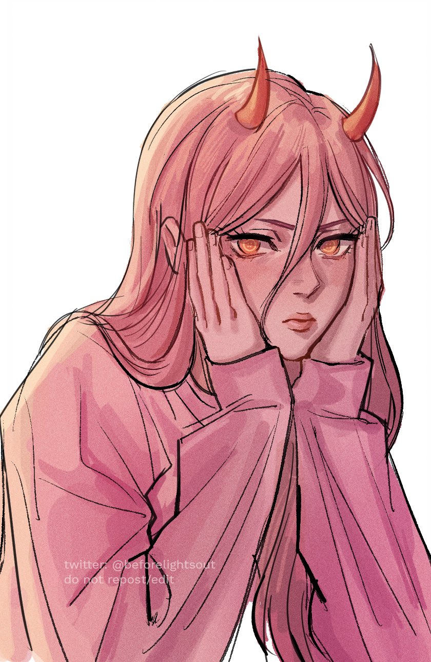 1girl brown_hair chainsaw_man cross-shaped_pupils hair_between_eyes hands_on_own_face highres horns liz_(beforelightsout) long_hair looking_at_viewer pink_sweater power_(chainsaw_man) red_horns simple_background solo sweater symbol-shaped_pupils twitter_username white_background yellow_eyes