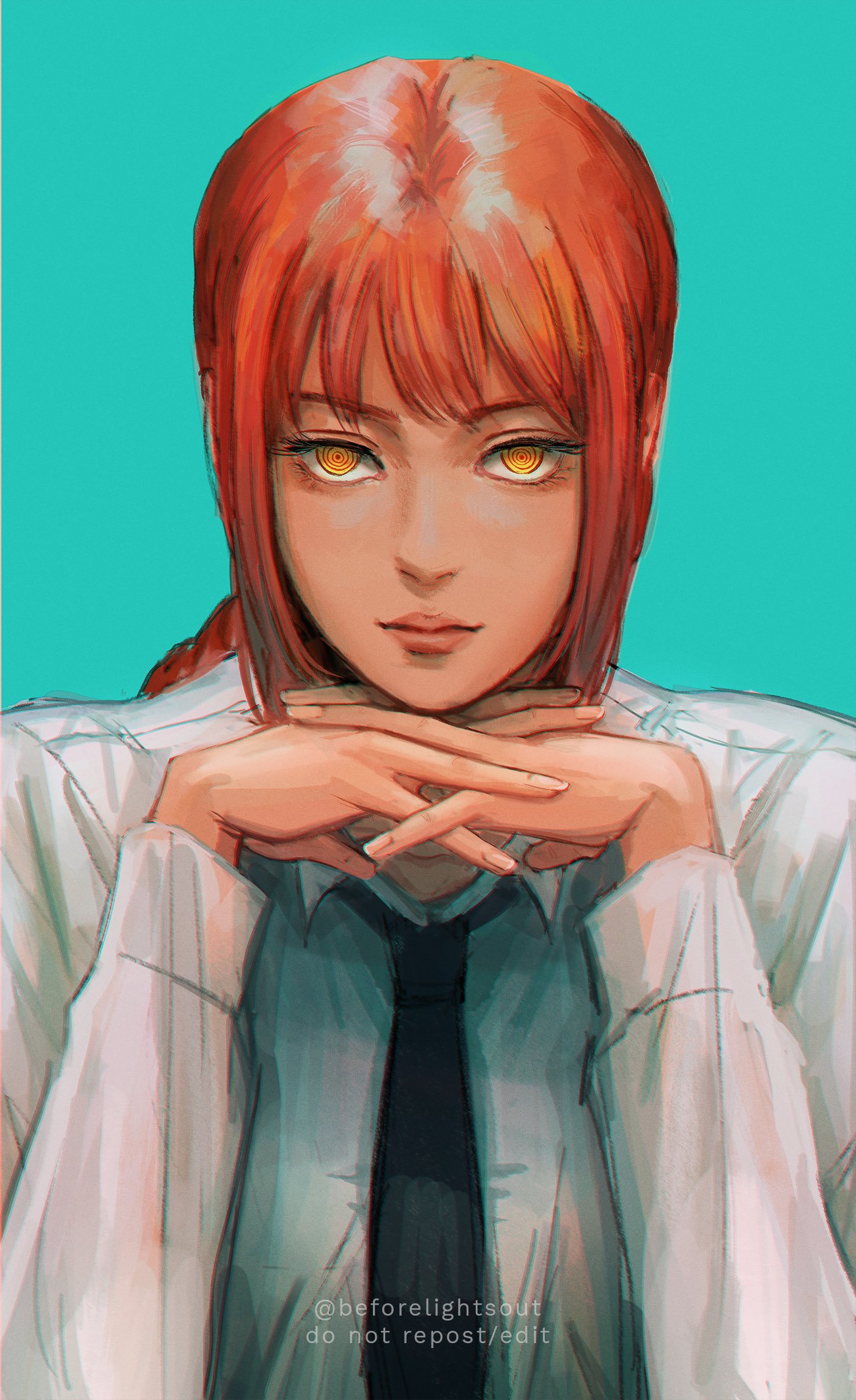 1girl black_necktie blue_background braid braided_ponytail chainsaw_man collared_shirt highres blue_background liz_(beforelightsout) looking_at_viewer makima_(chainsaw_man) medium_hair necktie own_hands_together red_hair ringed_eyes shirt sidelocks simple_background solo twitter_username white_shirt yellow_eyes