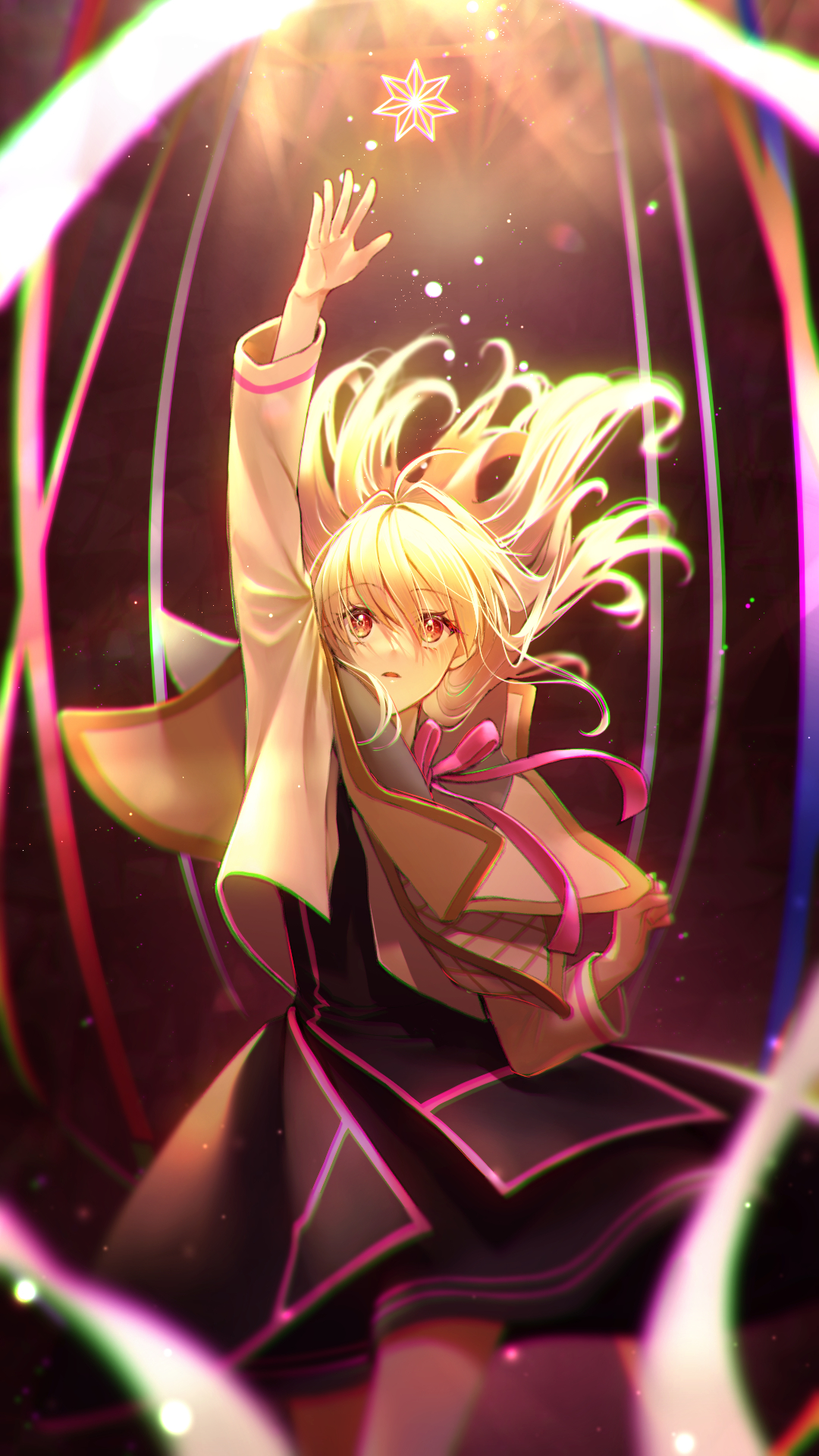 1girl black_dress blonde_hair bow capelet dress facing_up highres idolish7 long_hair long_sleeves looking_up open_mouth pink_bow pink_eyes purple_ribbon reaching red_ribbon ribbon saria-ryuuki solo star_(symbol) takanashi_tsumugi wavy_hair white_capelet