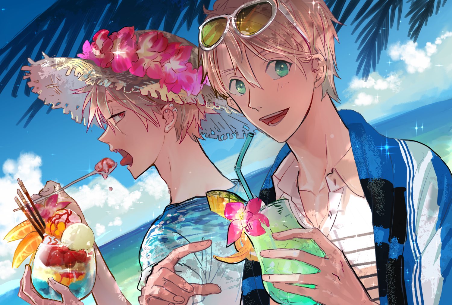 2boys alternate_costume blonde_hair blue_jacket blue_shirt cocktail cocktail_flower collared_shirt cup day drinking_glass dual_persona dutch_angle ear_piercing earrings eating eyewear_on_head fate/grand_order fate_(series) flower food fruit gradient_clothes gradient_shirt green_eyes hair_between_eyes hat hat_flower henry_jekyll_(fate) holding holding_cup holding_spoon hurricane_glass hyde_(fate) ice_cream jacket jekyll_and_hyde_(fate) jewelry letterman_jacket light_blush looking_at_viewer male_focus multiple_boys ocean open_collar open_mouth orange_(fruit) orange_slice orchid palm_tree parfait piercing pineapple pink_flower pocky profile red_eyes sharp_teeth shirt short_hair sideways_glance sparkle spoon straw_hat striped_clothes striped_shirt sunglasses t-shirt teeth towel towel_around_neck tree upper_body white_shirt yayayakan