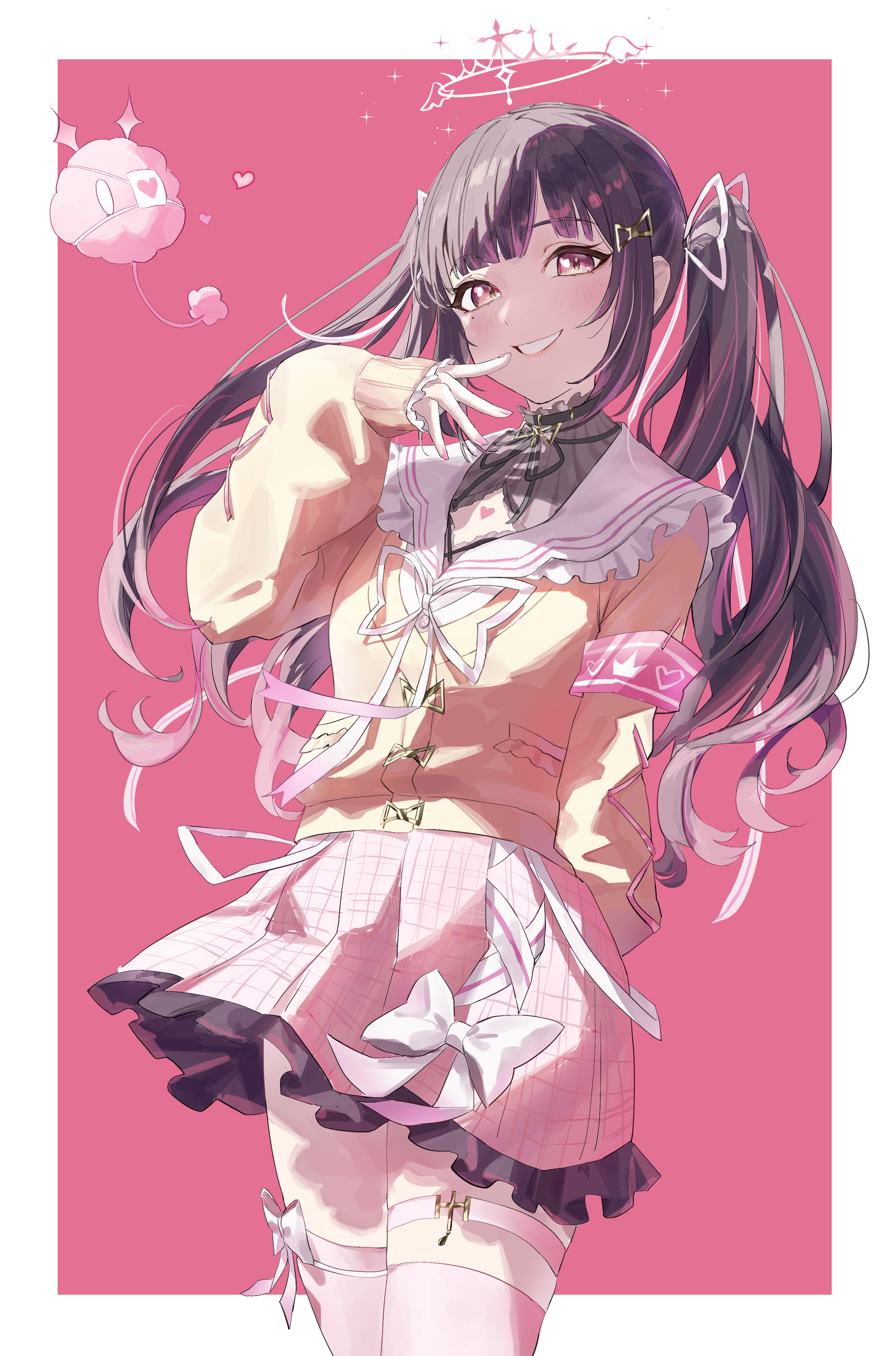 1girl absurdres arm_behind_back armband birthmark black_choker black_hair blunt_bangs blush border bow cardigan choker cleavage_cutout clothing_cutout collared_shirt commission frilled_shirt_collar frilled_skirt frills hair_ornament hair_ribbon heart highres hime_cut himemiya_rie himemiya_rie_(1st_costume) jirai_kei long_hair long_sleeves naruse_u phase_connect pink_armband pink_background pink_eyes pink_skirt pixiv_commission plaid_clothes plaid_skirt ribbon shirt skirt sleeves_past_wrists smile thigh_strap thighhighs tiara twintails virtual_youtuber white_border white_bow white_ribbon white_thighhighs yellow_cardigan