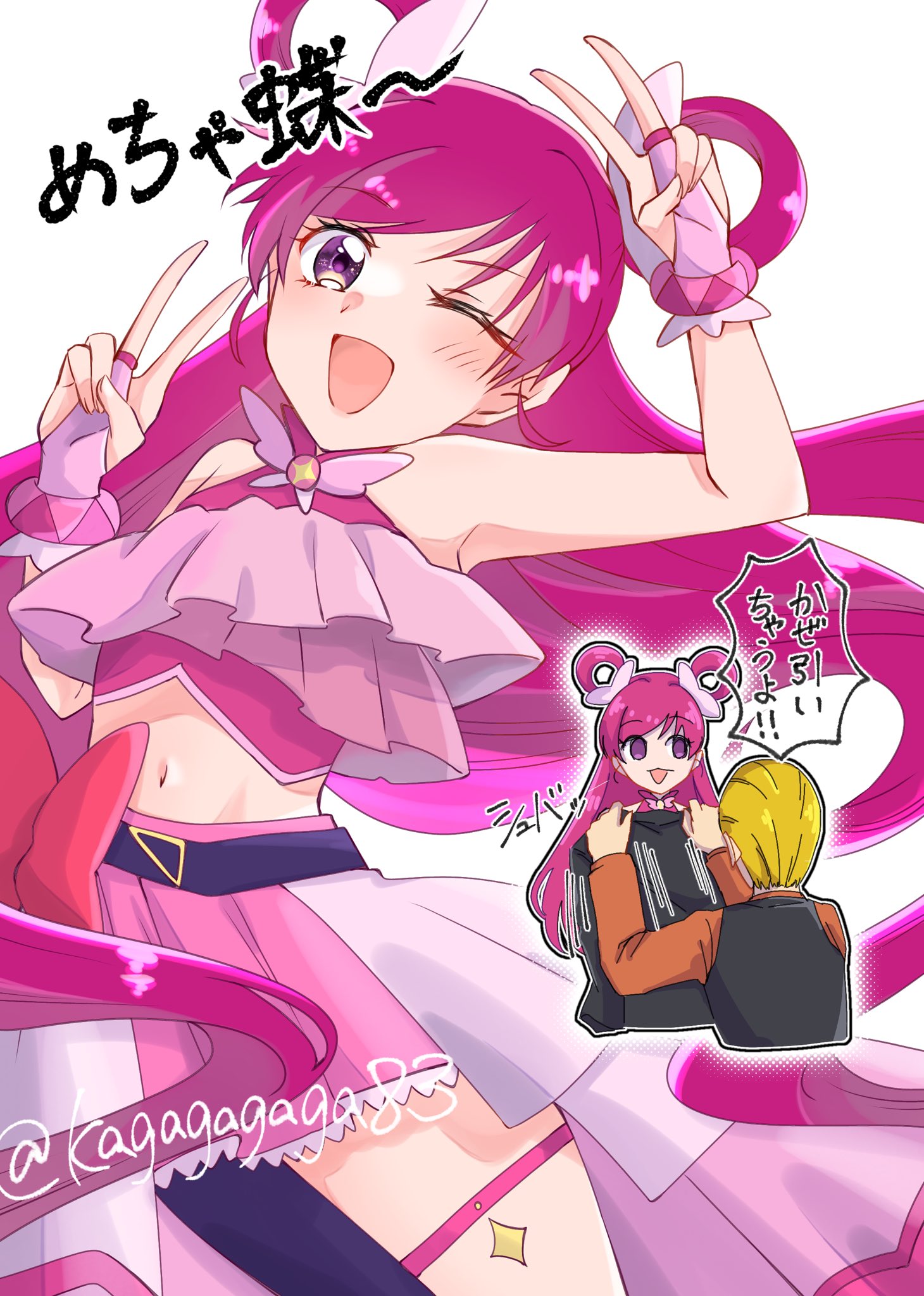 1boy 1girl belt_bow brooch bunbee_(precure) butterfly_brooch butterfly_earrings cosplay cure_butterfly cure_butterfly_(cosplay) cure_dream earrings frills hair_rings highres hirogaru_sky!_precure in-franchise_crossover jewelry kagagagaga83 long_hair magical_girl midriff pink_headwear pink_skirt precure shirt short_hair skirt vest yes!_precure_5 yumehara_nozomi