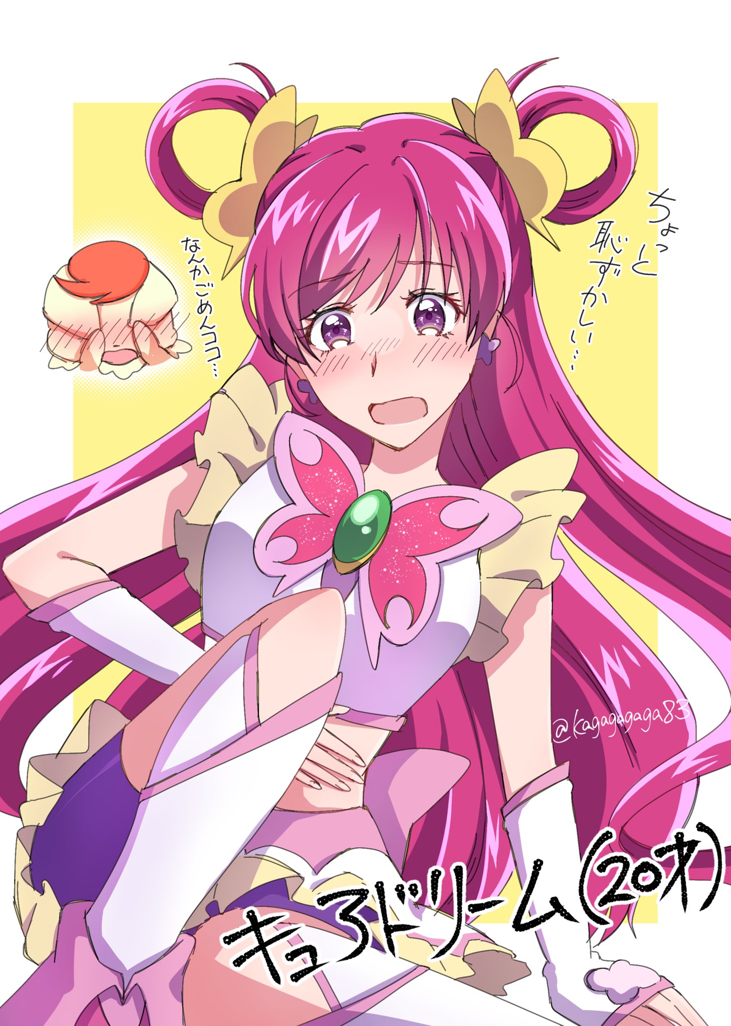 1girl 1other aged_up bike_shorts blush breasts brooch butterfly_brooch butterfly_earrings coco_(precure) cure_dream earrings embarrassed hair_ribbon hair_rings highres jewelry kagagagaga83 long_hair medium_breasts midriff open_mouth pink_hair precure purple_eyes ribbon skirt twitter_username yes!_precure_5 yumehara_nozomi