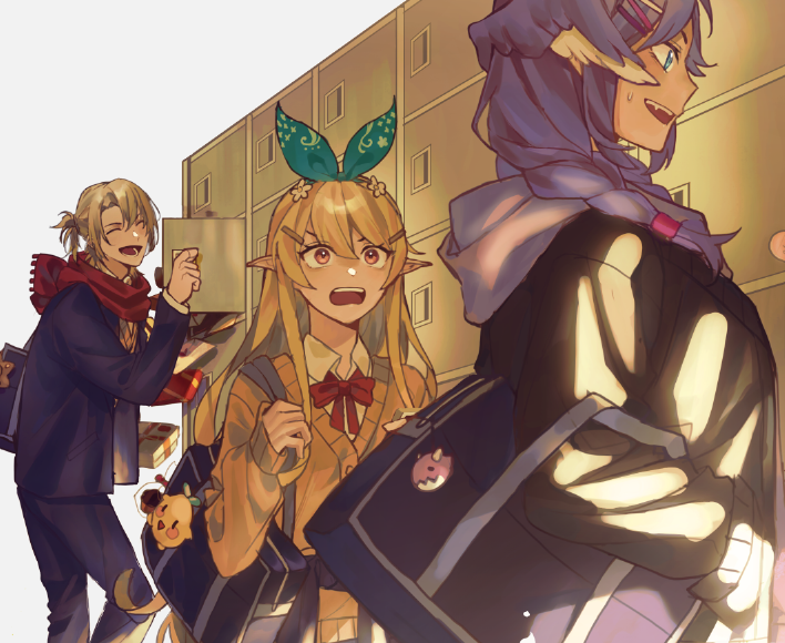 1boy 2girls ^_^ alternate_costume aqua_ribbon augustus_(luca_kaneshiro) bad_id bad_twitter_id black_cardigan blonde_hair blue_jacket blue_pants bow brown_cardigan brown_vest cardigan closed_eyes collared_shirt commentary dragoon_(selen_tatsuki) english_commentary flower hair_flower hair_ornament hair_ribbon hairclip head_wings jacket laughing locker long_hair long_pointy_ears luca_kaneshiro multiple_girls nijisanji nijisanji_en open_mouth pants papercider pointy_ears pomu_rainpuff pomudachi_(pomu_rainpuff) purple_hair red_bow red_scarf ribbon scarf school_uniform selen_tatsuki shirt smile surprised unfinished vest virtual_youtuber white_flower white_shirt wings