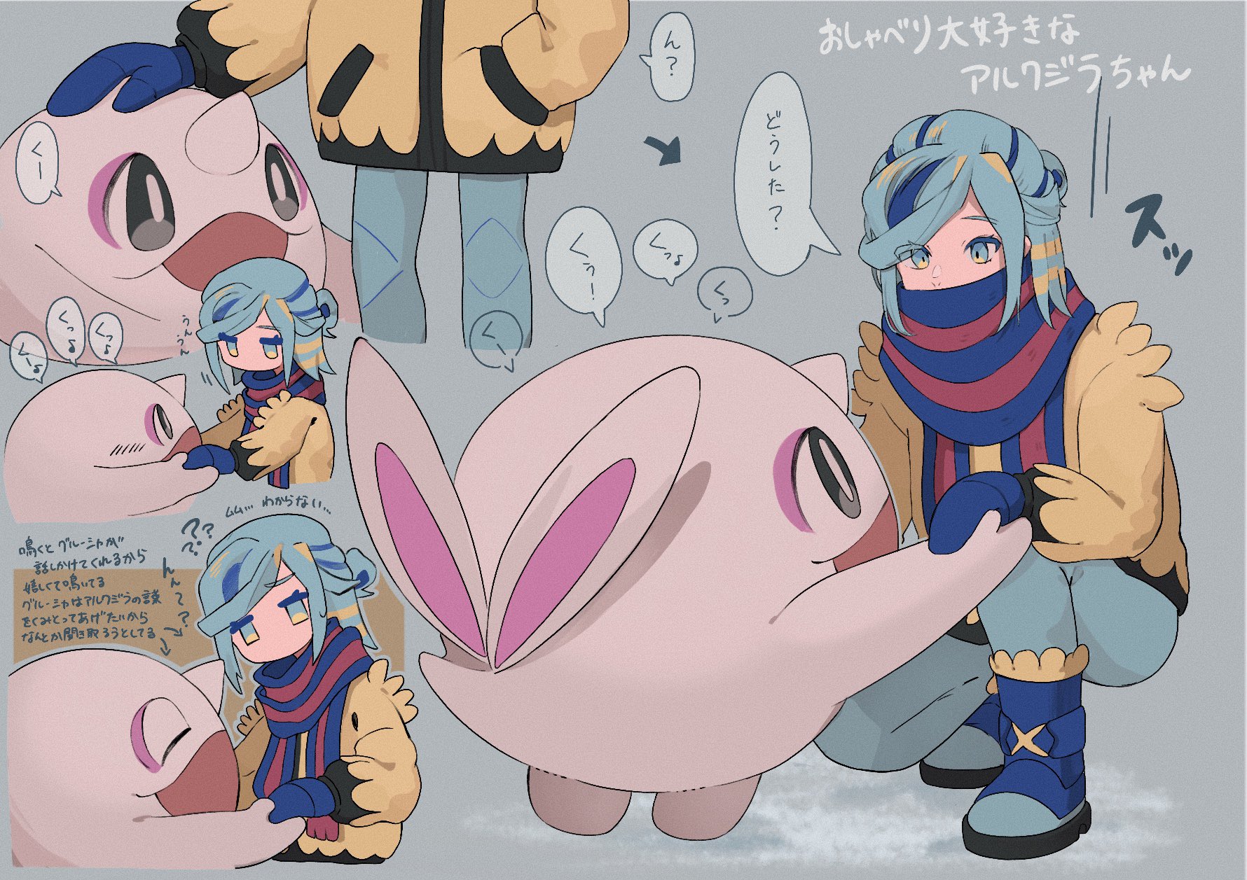 1boy 217_shion_407 androgynous blonde_hair blue_eyes blue_footwear blue_hair blue_mittens blue_scarf cetoddle grusha_(pokemon) highres jacket light_blue_hair long_hair long_sleeves mittens nintendo pants pokemon pokemon_(creature) pokemon_scarlet_and_violet red_scarf scarf scarf_over_mouth speech_bubble striped_clothes striped_scarf two-tone_scarf yellow_jacket