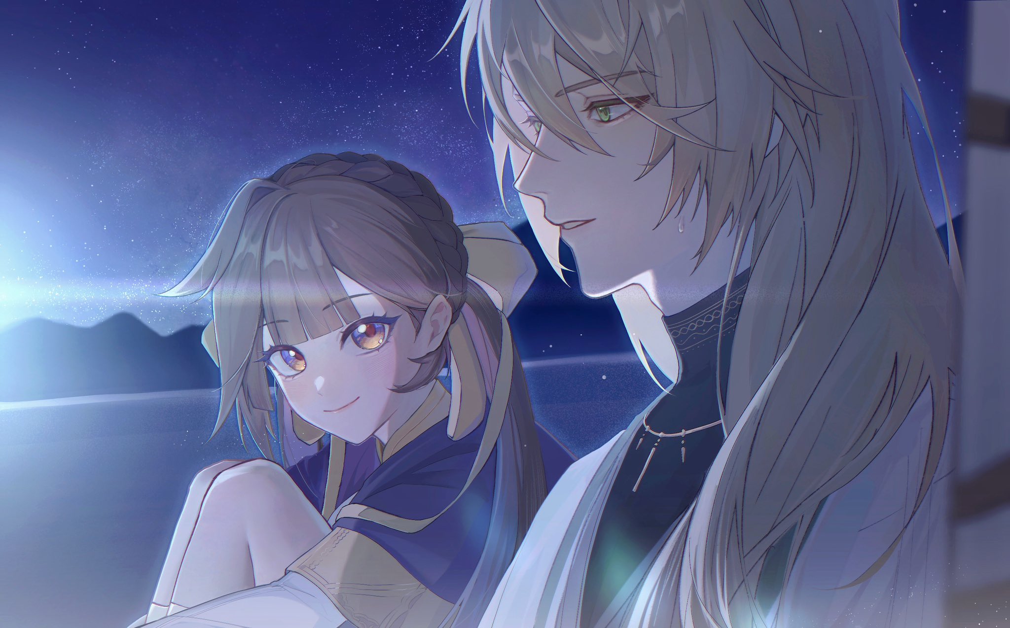 1boy 1girl blonde_hair brown_eyes brown_hair chinese_clothes closed_mouth green_eyes highres honkai:_star_rail honkai_(series) long_hair looking_at_another looking_to_the_side luocha_(honkai:_star_rail) moon napppptt night outdoors sky smile sushang_(honkai:_star_rail)