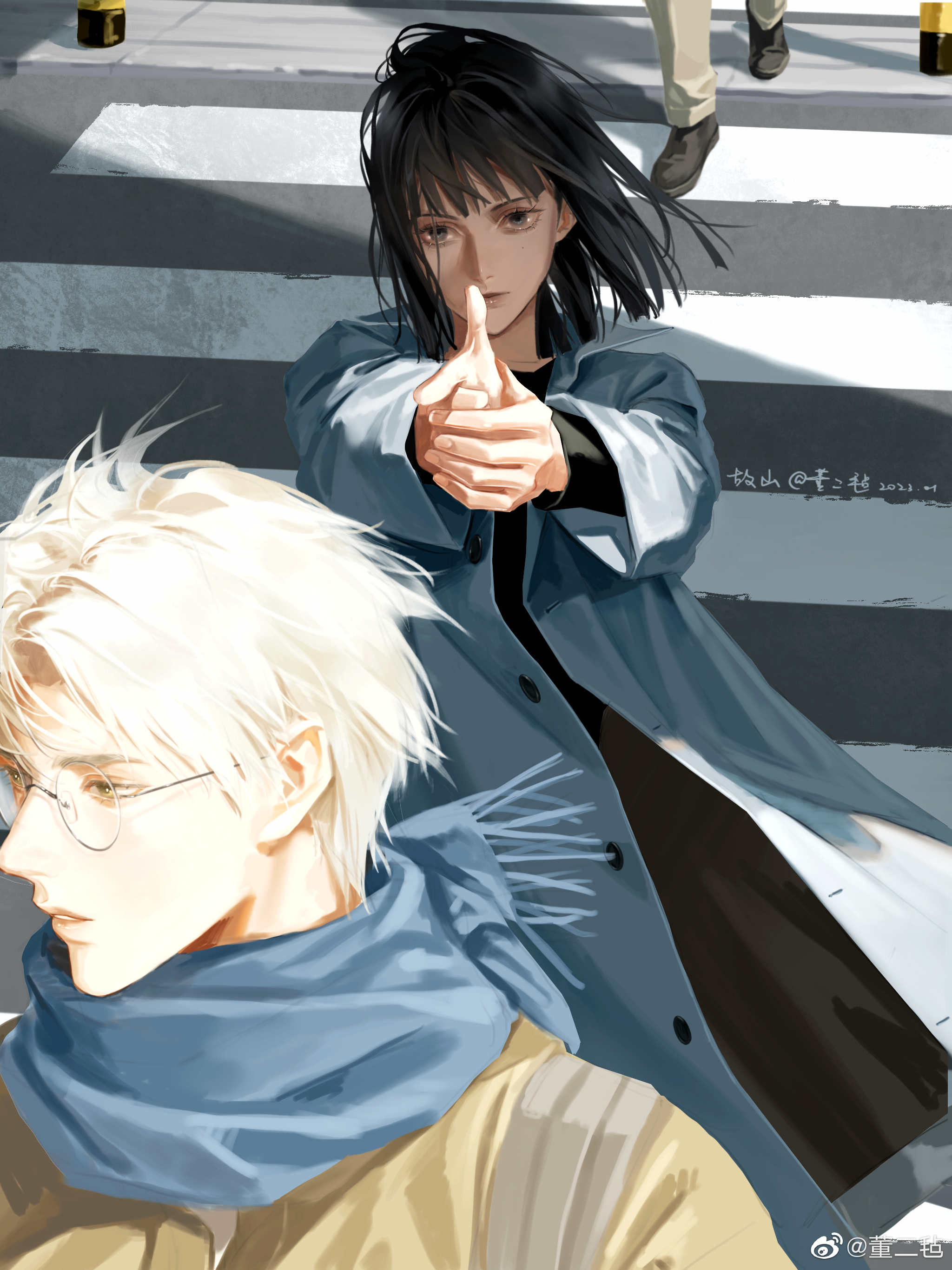 1boy 1girl absurdres black_eyes black_hair blonde_hair blue_jacket blue_scarf blunt_bangs blunt_ends chinese_commentary coat crosswalk dong_er_felt eyelashes finger_gun glasses highres jacket long_sleeves looking_at_another open_clothes open_coat original parted_lips pointing pointing_at_another road round_eyewear scarf short_hair straight_hair street watermark weibo_watermark weibo_watermark white_hair wind yellow_eyes