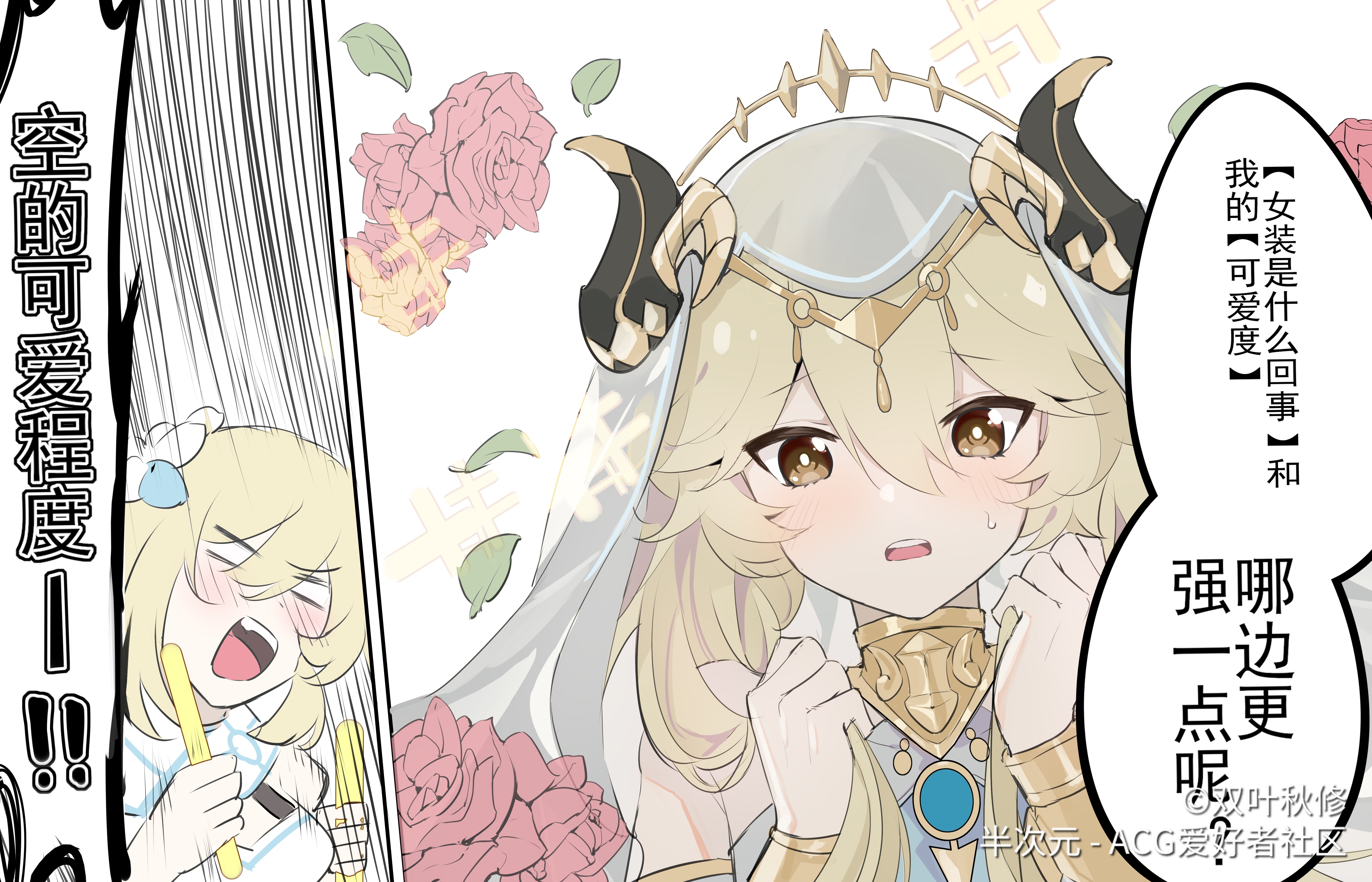 1boy 1girl absurdres aether_(genshin_impact) blush eyebrows_hidden_by_hair fake_horns flower genshin_impact hair_between_eyes hair_flower hair_ornament highres holding holding_own_hair horns long_hair looking_at_viewer lumine_(genshin_impact) mairimashita!_iruma-kun nilou_(genshin_impact) open_mouth short_hair smile upper_body veil wocalei2