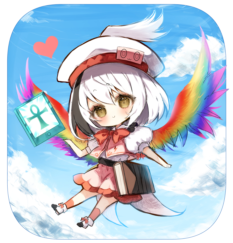 1girl ankh bird_wings blush book brown_eyes closed_mouth coattails duel_monster feathered_wings full_body hair_between_eyes hat heart hollow_song_of_birds kneehighs monster_reborn multicolored_wings original pink_shorts pink_vest piyokichi rainbow_gradient rainbow_wings red_socks revision shirt shoes short_hair short_sleeves shorts smile socks solo tailcoat torisumi_horou touhou vest white_hair white_hat white_shirt white_shoes wings yu-gi-oh!