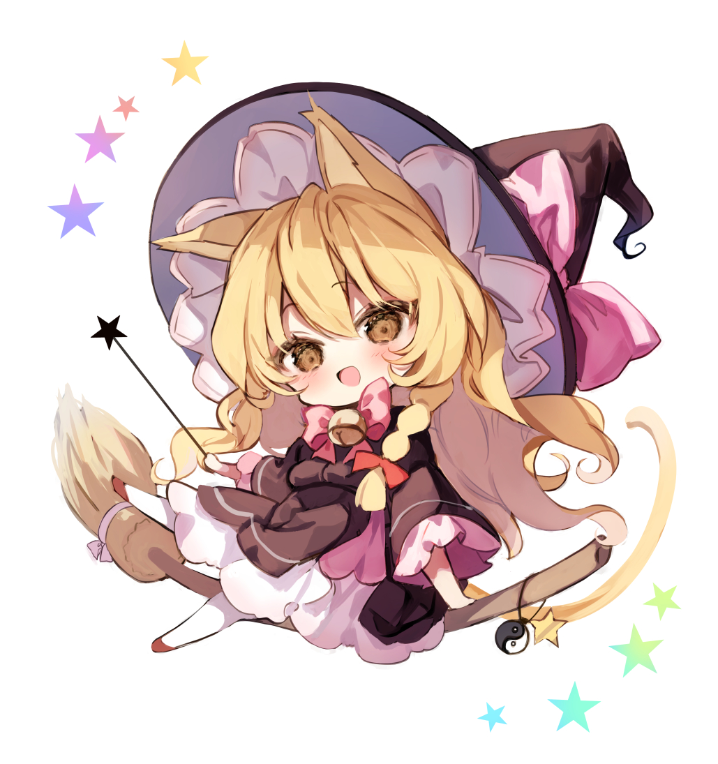 1girl animal_ears black_dress black_hat blonde_hair braid broom broom_riding cat_ears chibi dress frilled_sleeves frills full_body hat holding holding_wand kirisame_marisa long_hair long_sleeves orb piyokichi revision simple_background single_braid solo star_(symbol) touhou wand white_background witch_hat yellow_eyes yin_yang yin_yang_orb