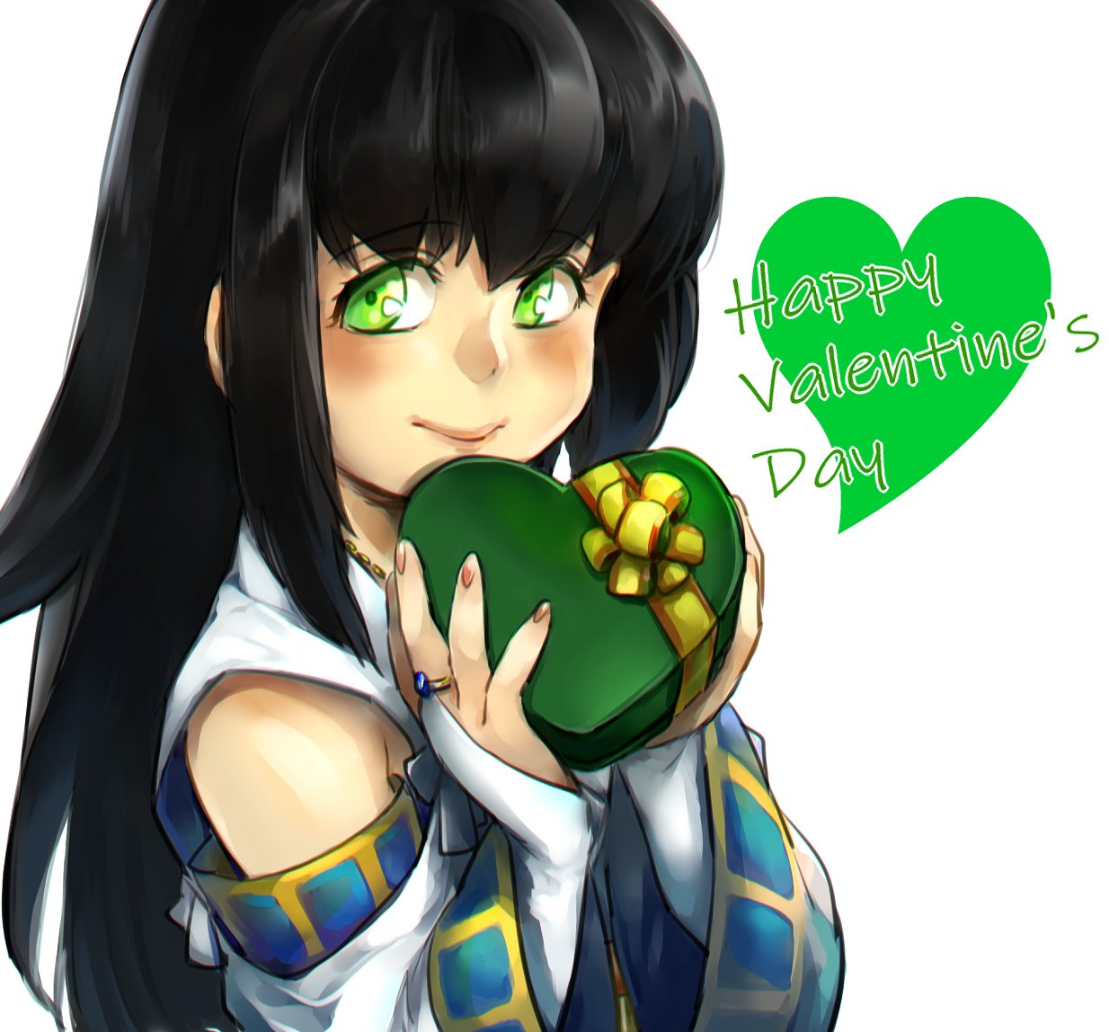 1girl black_hair box bridal_gauntlets closed_mouth detached_sleeves gensou_suikoden green_eyes happy_valentine heart-shaped_box ikunosake jewelry long_hair long_sleeves looking_at_viewer necklace simple_background smile solo valentine viki_(suikoden) white_background