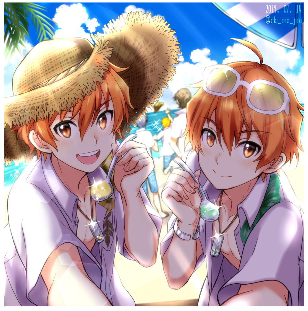 2019 5boys ahoge aki_ma_jiro aoi_kyosuke aoi_yusuke beach blue_sky bracelet brothers cloud dated fingernails glasses hair_between_eyes hat holding holding_spoon idolmaster idolmaster_side-m jewelry looking_at_viewer maita_rui male_focus multiple_boys necklace open_clothes open_shirt orange_eyes orange_hair sakaki_natsuki short_sleeves siblings sky smile spoon sunglasses teeth twins upper_teeth_only yamashita_jiro