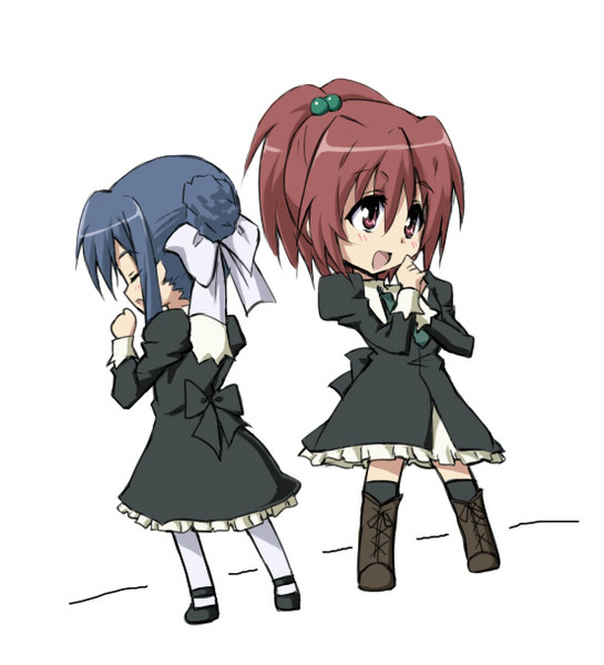 00s 2girls aoi_nagisa blue_hair bow chibi dress long_sleeves multiple_girls open_mouth own_hands_together red_hair school_uniform simple_background strawberry_panic! suzumi_tamao white_background white_legwear