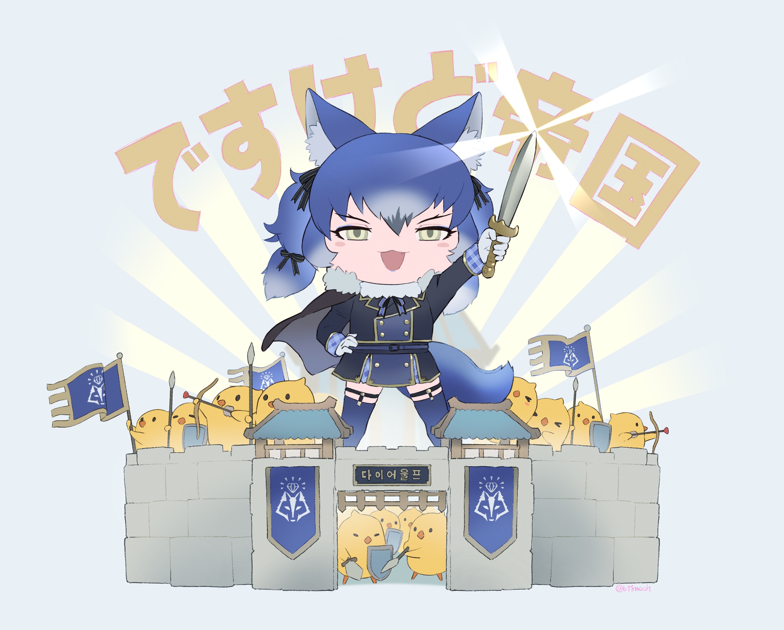 1girl animal_ears beleven castle dire_wolf_(kemono_friends) extra_ears highres kemono_friends kemono_friends_v_project parody rise_of_kingdoms sword tail virtual_youtuber weapon wolf_ears wolf_girl wolf_tail