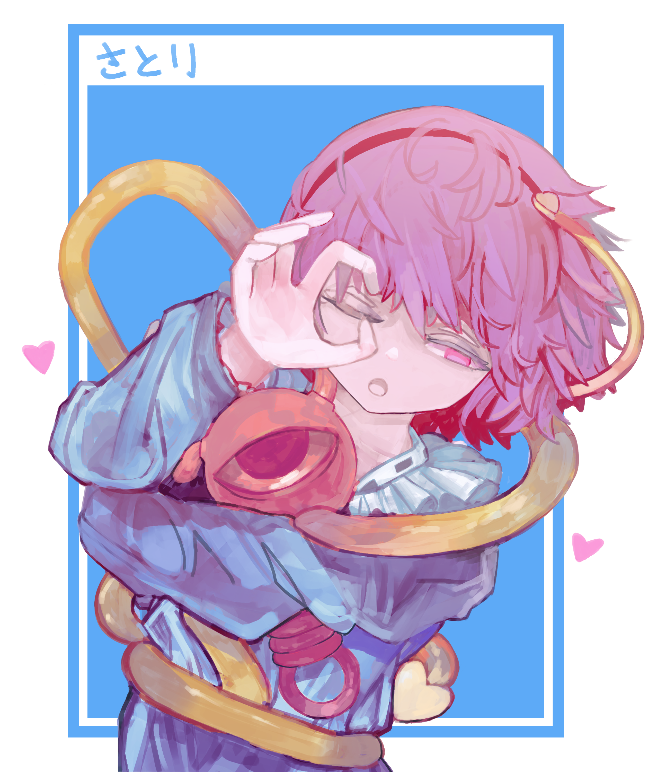 absurdres black_hairband blue_shirt chizno eyeball frilled_shirt_collar frilled_sleeves frills hair_ornament hairband heart heart_hair_ornament highres komeiji_satori messy_hair one_eye_closed open_mouth pink_eyes pink_hair shirt short_hair subterranean_animism third_eye touhou translation_request