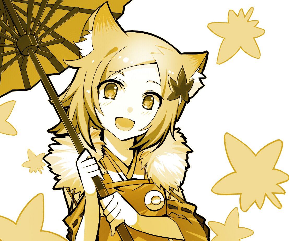 1girl animal_ears blush detached_sleeves dress fox_ears fur_collar geta hair_ornament holding holding_umbrella japanese_clothes kogitsunemaru_(tenka_hyakken) leaf maple_leaf oil-paper_umbrella onasu_(sawagani) open_mouth parted_bangs short_hair sleeveless sleeveless_dress smile tenka_hyakken umbrella yellow_theme