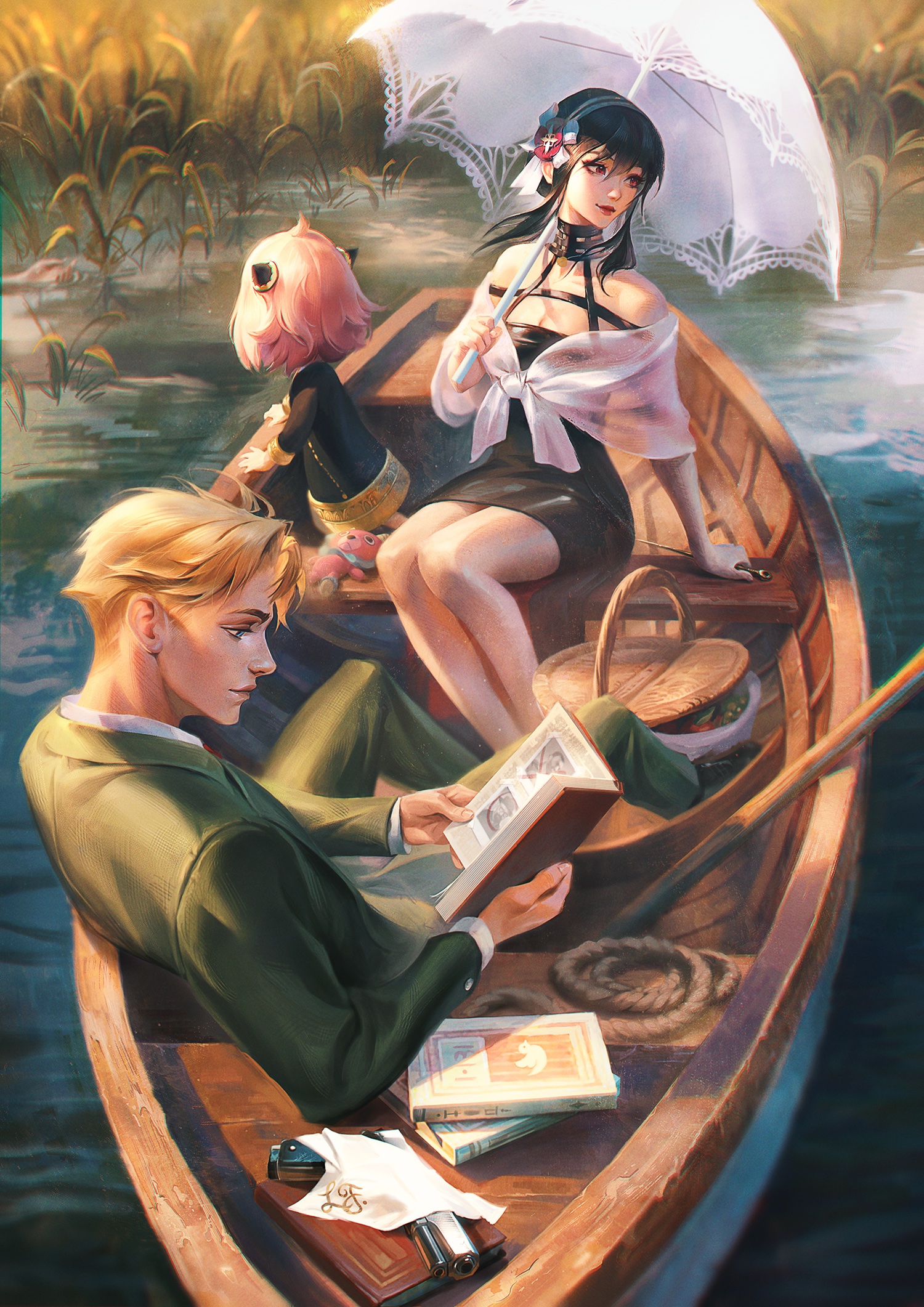 1boy 2girls adoptive_parent_and_adoptive_child anya_(spy_x_family) asphyxiation bare_shoulders basket black_choker black_dress black_footwear blonde_hair blue_eyes boat book breaking_bad breasts child choker cleavage closed_mouth collarbone cone_hair_bun dagger death director_chimera_(spy_x_family) dress drowning eden_academy_school_uniform father_and_child father_and_daughter formal_clothes frilled_umbrella frills gigachad_(meme) green_pants green_suit gun hair_bun hairband hairpods hand_rest handgun highres holding holding_book holding_dagger holding_knife holding_umbrella holding_weapon husband_and_wife knife lake long_sleeves looking_away looking_to_the_side medium_breasts meme mother_and_child mother_and_daughter multiple_girls napkin open_book pants parasol parent_and_child partially_submerged picnic_basket pink_hair reading red_circle red_eyes red_lips red_tie rope rowboat school_uniform shirt short_hair_with_long_locks sitting sleeveless spy_x_family stiletto_(weapon) stuffed_toy suit twilight_(spy_x_family) umbrella walter_white watercraft weapon white_hairband white_shirt white_umbrella yor_briar zoe_(crownsforkings)