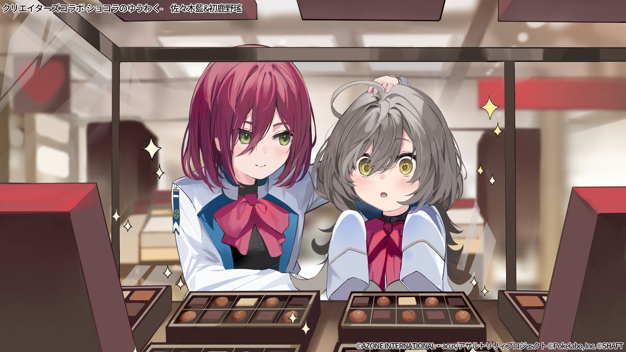 2girls :o ahoge arm_up aroa_(aroamoyasi) assault_lily black_shirt blurry blurry_background blush bow bowtie box box_of_chocolates buttons chocolate closed_mouth commentary_request glass green_eyes grey_hair grey_pantyhose hair_between_eyes hand_on_another's_head hand_up hatsukano_yo heart herensuge_girls_academy_school_uniform highres indoors jacket long_bangs long_hair long_sleeves looking_at_another looking_at_food looking_to_the_side medium_hair multicolored_hair multiple_girls official_art open_box open_clothes open_jacket oversized_clothes pantyhose parted_lips red_bow red_bowtie red_hair sasaki_ran school_uniform shirt shop sideways_glance sleeves_past_fingers sleeves_past_wrists smile sparkle squatting streaked_hair translation_request upper_body watermark white_jacket wide-eyed yellow_eyes