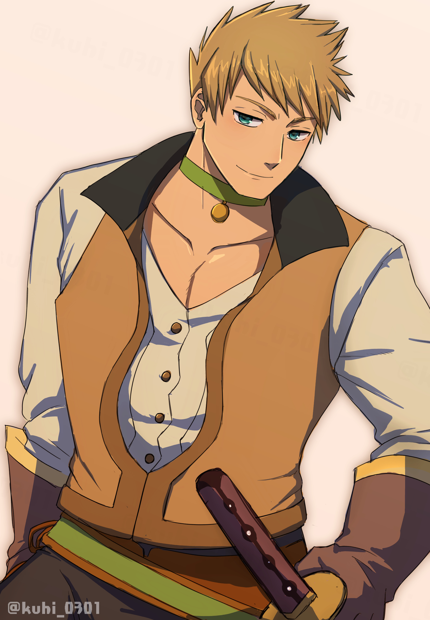 1boy artist_name black_pants blonde_hair blue_eyes brown_gloves choker collarbone gloves green_choker guy_cecil highres hiota_(kuhi_0301) holding holding_sheath long_sleeves looking_at_viewer male_focus pants pectoral_cleavage pectorals sheath sheathed shirt short_hair smile sword tales_of_(series) tales_of_the_abyss upper_body vest waistcoat weapon white_background white_shirt