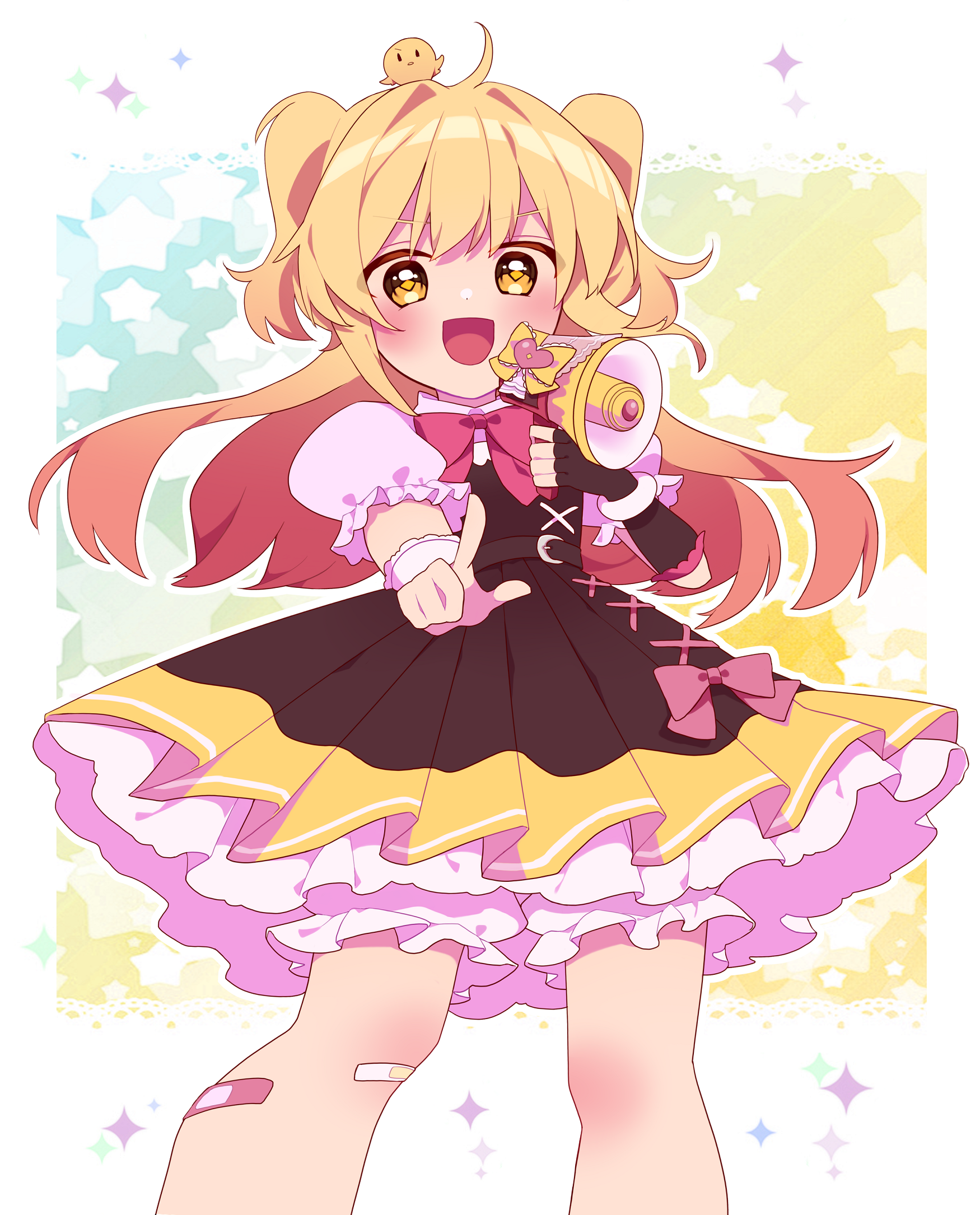 1girl animal animal_on_head baby_animal bandaid bandaid_on_knee bandaid_on_leg bird black_dress blonde_hair blush bow bowtie chick dress frills hair_between_eyes highres holding holding_megaphone long_hair looking_at_viewer megaphone multicolored_background on_head open_mouth pmaru-sama pointing pointing_at_viewer puffy_short_sleeves puffy_sleeves red_ribbon ribbon s'il_vous_president shirt short_sleeves smile solo sparkle standing star_(symbol) two_side_up umecha_0 virtual_youtuber white_shirt wrist_cuffs yellow_eyes