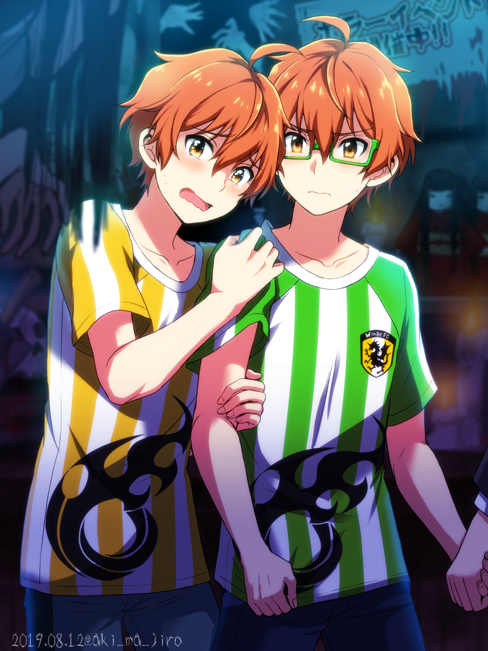 2019 2boys ahoge aki_ma_jiro aoi_kyosuke aoi_yusuke brothers dated fingernails green-framed_eyewear highres holding_hands idolmaster idolmaster_side-m male_focus multiple_boys nervous orange_eyes orange_hair out_of_frame print_shirt scared shirt short_sleeves siblings sportswear striped_clothes striped_shirt tears twins
