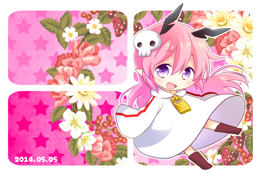1girl blush chibi cielfloria flower food fruit hair_ornament head_wings long_hair looking_at_viewer open_mouth pink_hair pointy_ears purple_eyes ruki_(senyuu) sen'yuu. skull_hair_ornament smile star_(symbol) strawberry wings