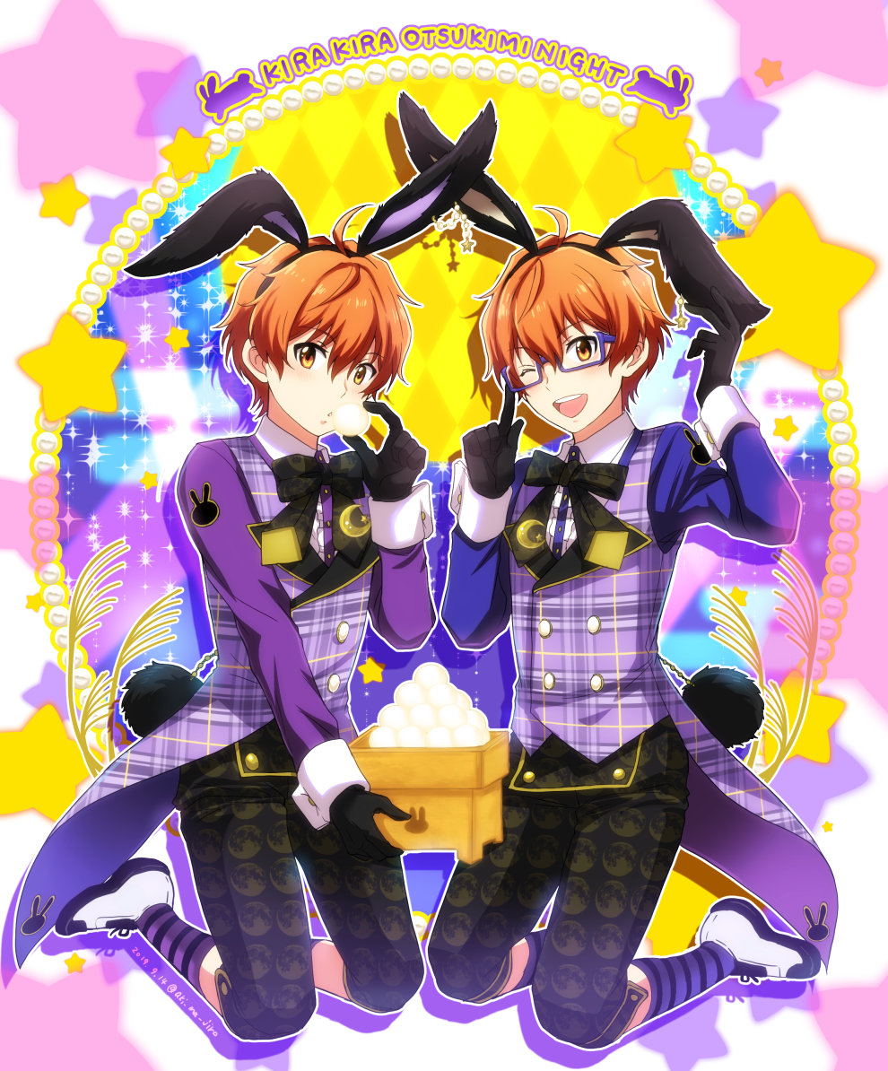 2boys ahoge aki_ma_jiro animal_ears animal_print aoi_kyosuke aoi_yusuke ball black_gloves brothers buttons cotton_ball crescent crescent_pin fake_animal_ears glasses gloves hair_between_eyes idolmaster idolmaster_side-m long_sleeves male_focus multiple_boys one_eye_closed purple-framed_eyewear rabbit_print shoes siblings socks star_(symbol) striped_clothes striped_socks teeth upper_teeth_only