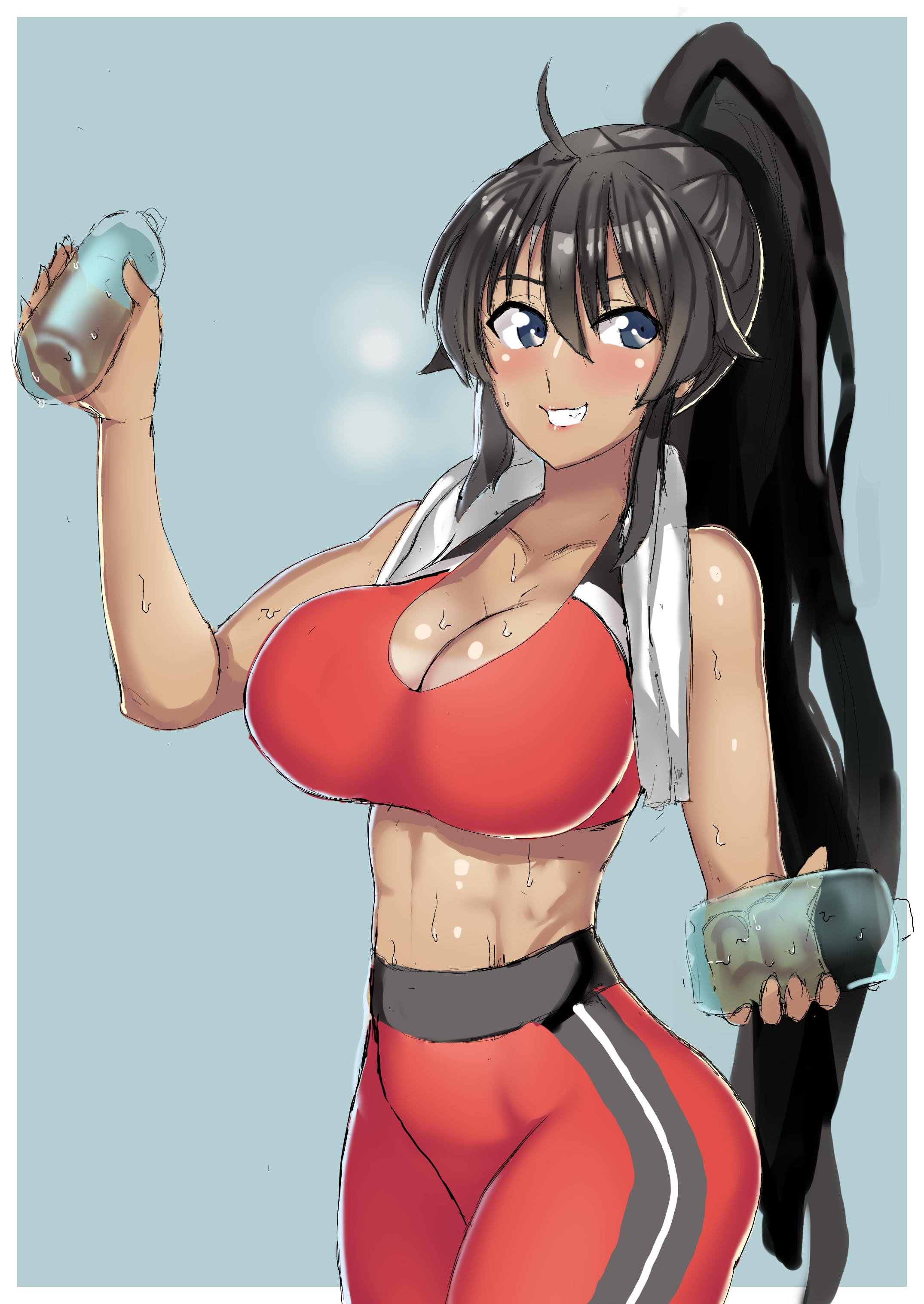 1girl absurdres ahoge aqua_background arm_up black_hair blue_eyes bottle breasts cleavage collarbone dark-skinned_female dark_skin gym_pants highres holding holding_bottle homura_(senran_kagura) jeaike_art large_breasts lips long_hair looking_at_viewer pants ponytail senran_kagura senran_kagura_estival_versus senran_kagura_shinovi_versus shiny_skin sidelocks simple_background smile sports_bra sportswear sweat teeth towel towel_around_neck water_bottle