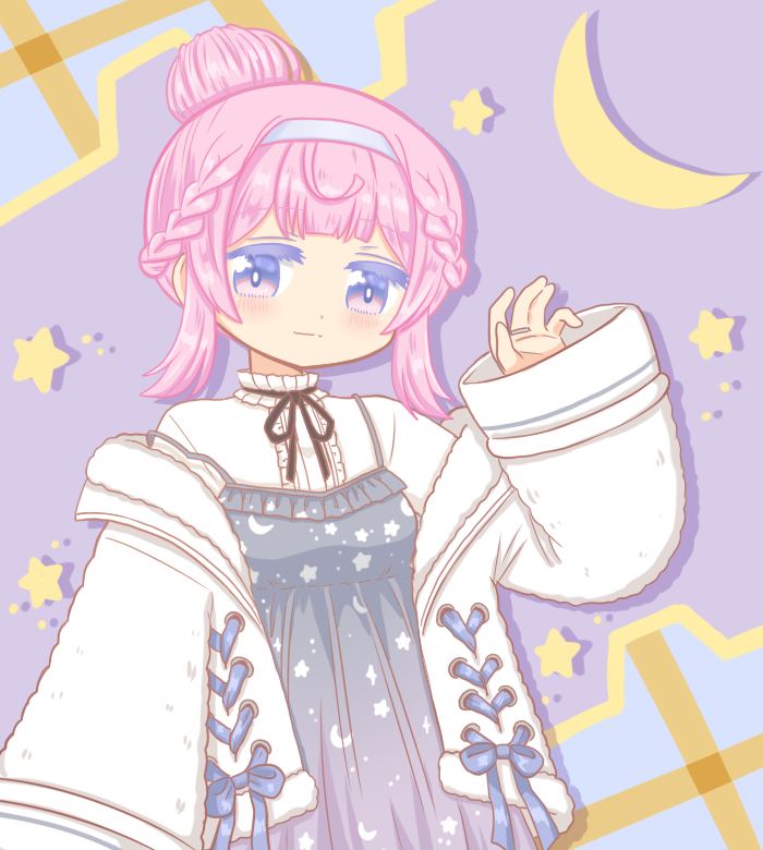 1girl black_ribbon blue_ribbon blunt_bangs blush braid closed_mouth crescent hair_bun hairband jacket long_sleeves looking_at_viewer magia_record:_mahou_shoujo_madoka_magica_gaiden mahou_shoujo_madoka_magica official_alternate_costume pink_hair purple_eyes reverse_(bluefencer) ribbon short_hair side_braid single_hair_bun smile solo star_(symbol) white_jacket wide_sleeves yura_hotaru yura_hotaru_(winter_costume)
