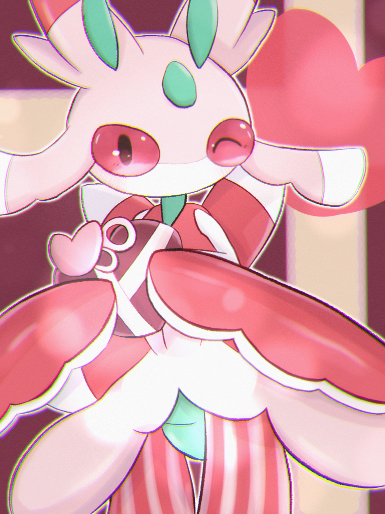 chromatic_aberration commentary_request cowboy_shot gen_7_pokemon holding looking_at_viewer lurantis nintendo no_humans one_eye_closed pink_ribbon pokemon pokemon_(creature) ribbon shito_(luyumash) solo valentine