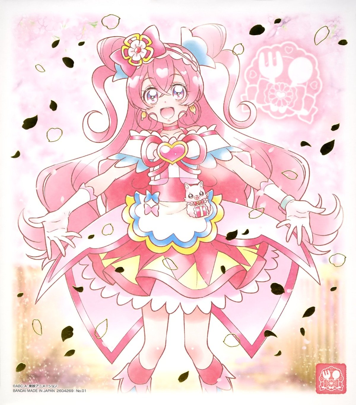 1girl apron brooch choker cone_hair_bun cure_precious delicious_party_precure earrings gloves hair_bun heart heart_brooch highres huge_bow jewelry kome-kome long_hair magical_girl nagomi_yui official_art petals pink_choker pink_hair precure purple_eyes solo third-party_source two_side_up very_long_hair white_gloves