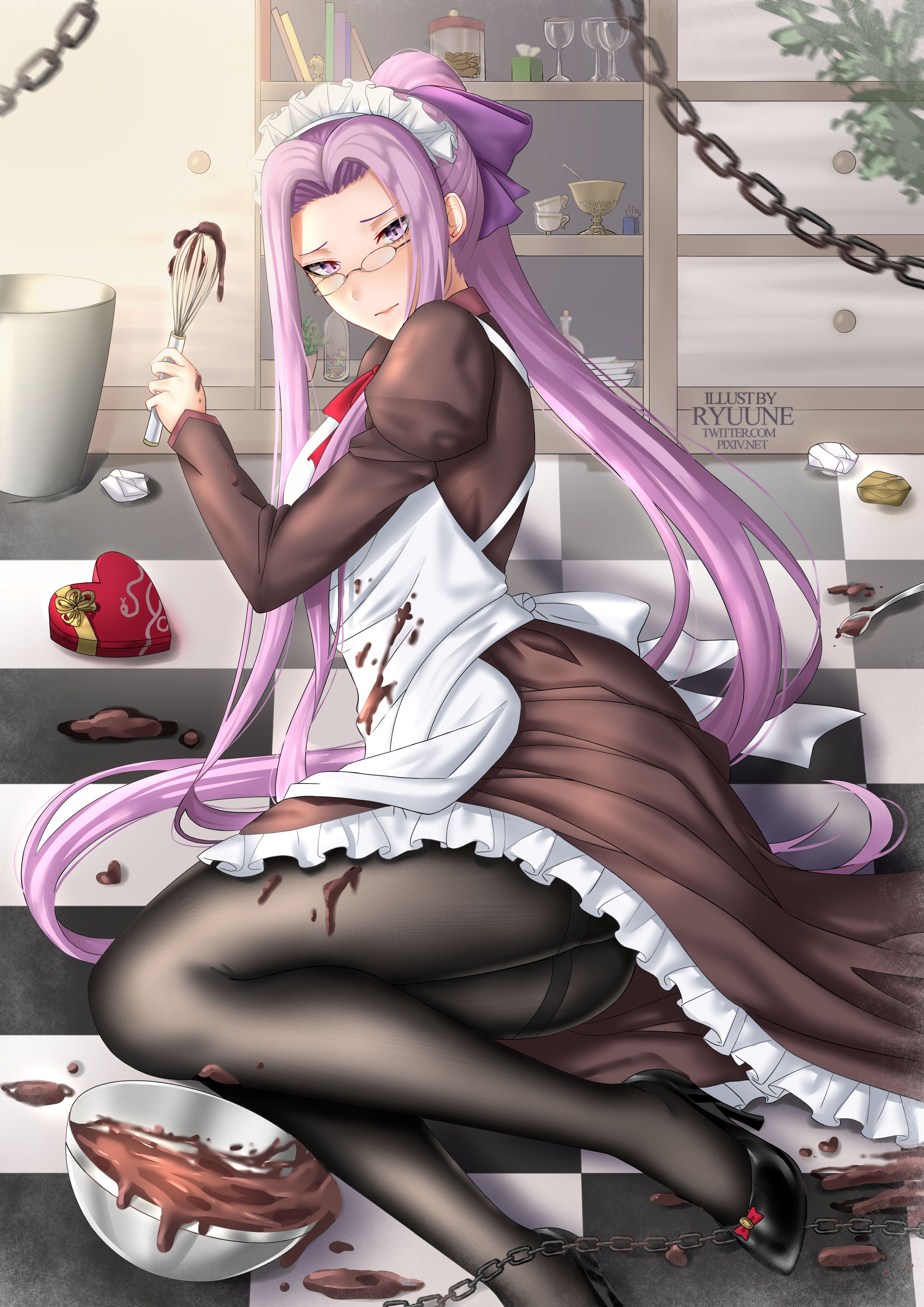 1girl absurdres apron artist_name black_footwear black_pantyhose bow box brown_dress chain chocolate closed_mouth commentary dress english_commentary fate/hollow_ataraxia fate/stay_night fate_(series) forehead frilled_dress frills glasses hair_bow heart-shaped_box high_heels highres holding holy_grail_(fate) indoors juliet_sleeves lips long_hair long_sleeves looking_at_viewer maid maid_apron maid_headdress medusa_(fate) medusa_(rider)_(fate) official_alternate_costume pantyhose pink_bow pink_eyes pink_hair pink_lips ponytail puffy_sleeves ryuuneart solo square_pupils straight_hair valentine very_long_hair white_apron