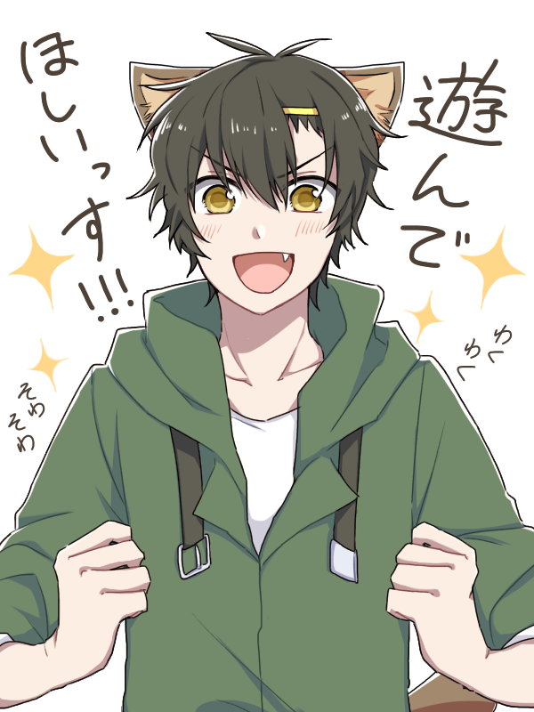 ! !! 1boy animal_ears black_hair blush casual collarbone commentary drawstring fang green_hoodie hair_between_eyes hair_ornament hairclip hood hood_down hoodie kagerou_project kanako-n-03-04 kemonomimi_mode looking_at_viewer male_focus mekakucity_actors open_mouth seto_kousuke shirt short_hair simple_background solo sound_effects t-shirt tail translated upper_body white_background white_shirt