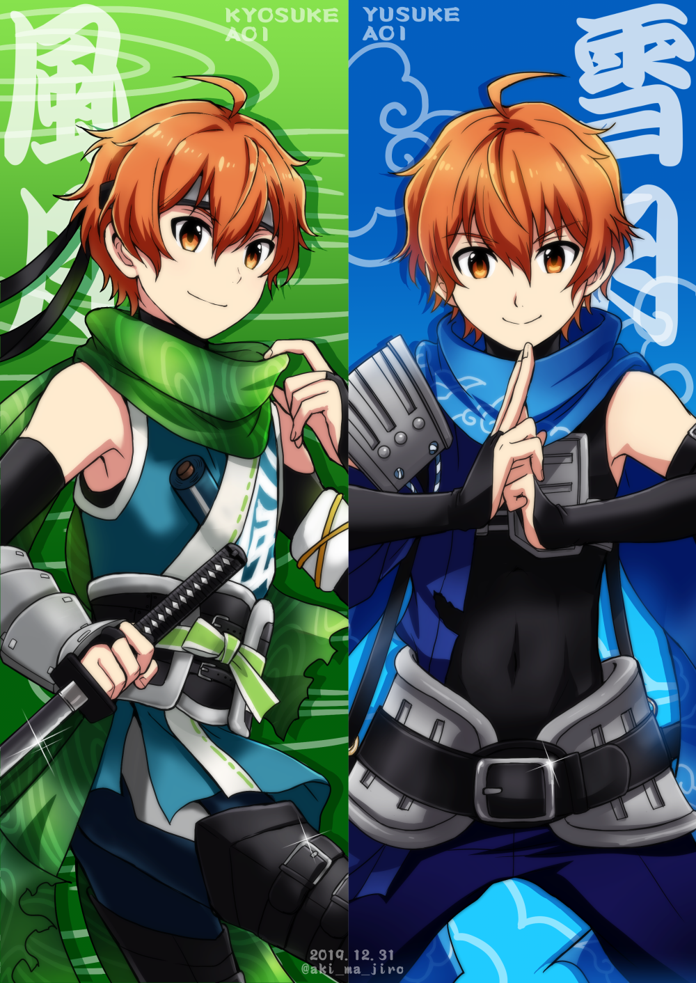 2019 2boys ahoge aki_ma_jiro aoi_kyosuke aoi_yusuke armor belt blue_scarf brothers character_name dated fingerless_gloves fingernails gloves green_scarf hair_between_eyes headband highres holding holding_weapon idolmaster idolmaster_side-m male_focus multiple_boys ninja orange_eyes orange_hair scarf shoulder_armor siblings sleeveless smile twins weapon