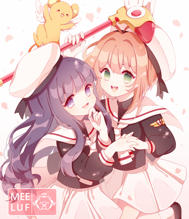 2girls brown_hair cardcaptor_sakura child daidouji_tomoyo green_eyes holding_hands kero_(cardcaptor_sakura) kinomoto_sakura meelaffs multiple_girls purple_eyes purple_hair sailor_collar school_uniform skirt tomoeda_elementary_school_uniform tomoeda_middle_school_uniform white_headwear white_sailor_collar white_skirt wings