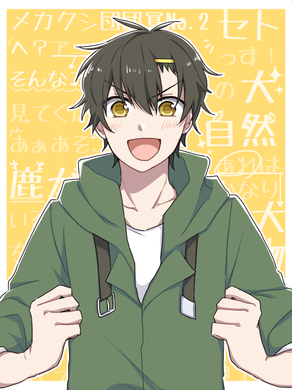 1boy text_background black_hair border buckle casual character_name clenched_hands collarbone commentary eyes_visible_through_hair green_hoodie hair_between_eyes hair_ornament hair_over_eyes hairclip hood hood_down hoodie kagerou_project kanako-n-03-04 light_blush looking_at_viewer male_focus mekakucity_actors open_mouth outline outside_border seto_kousuke shirt short_hair sleeves_rolled_up solo straight-on t-shirt white_border white_outline white_shirt yellow_background yellow_eyes