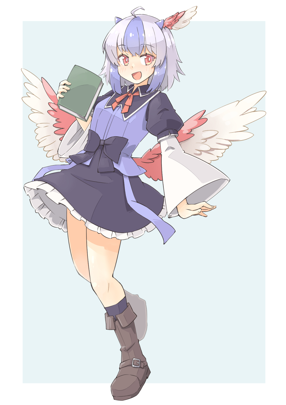 1girl ahoge arnest bird_wings black_ribbon black_skirt black_socks blue_hair blue_horns blue_ribbon blush book boots border brown_boots commission feathered_wings frilled_skirt frills grey_hair head_wings highres holding holding_book horns long_sleeves multicolored_hair open_mouth red_eyes red_ribbon red_wings ribbon short_hair single_head_wing skeb_commission skirt smile socks solo tokiko_(touhou) touhou two-tone_hair white_border white_wings wide_sleeves wings