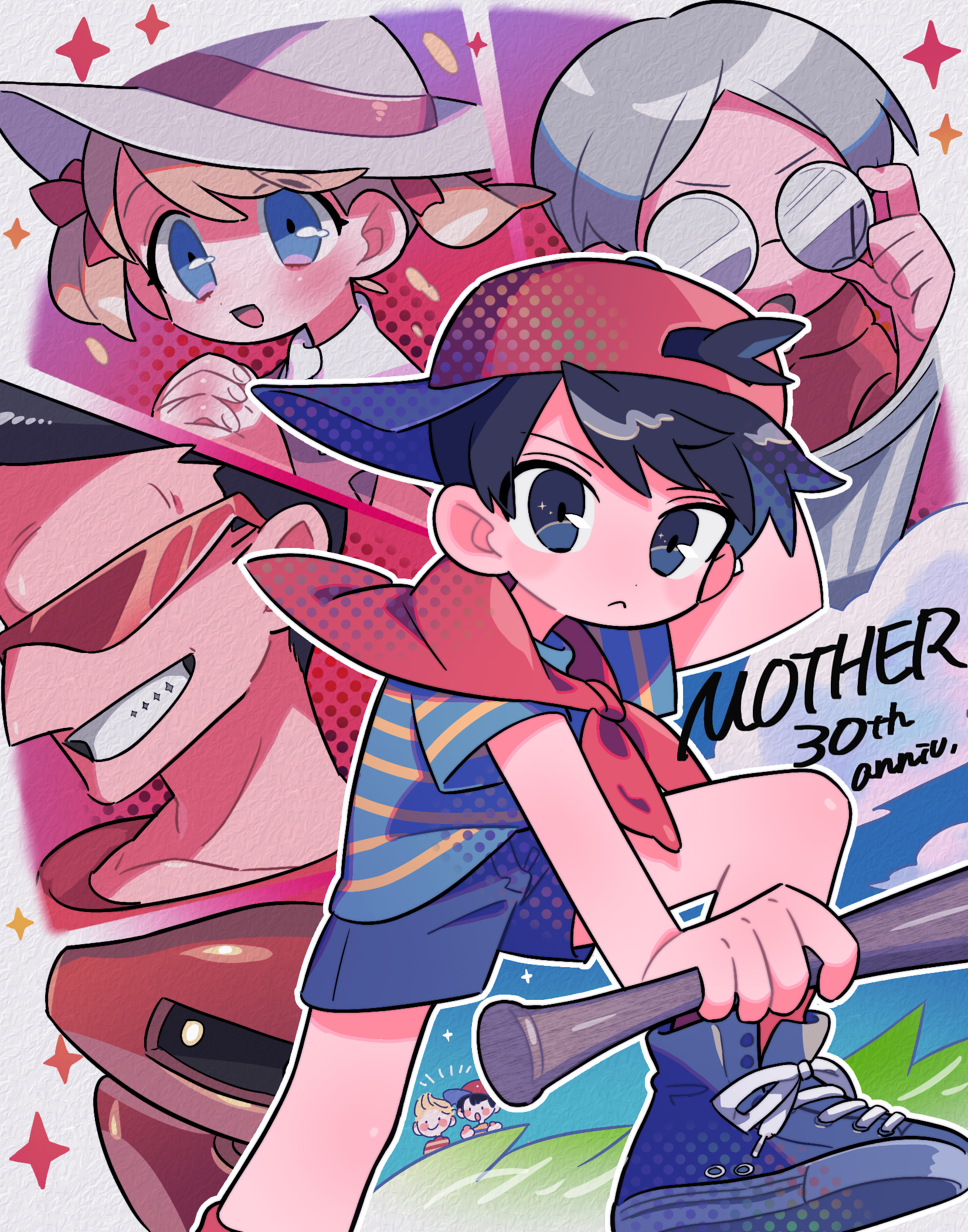 1girl 6+boys adjusting_eyewear ana_(mother) anniversary ascot baseball_bat baseball_cap black_eyes black_hair blonde_hair blue_eyes blue_footwear blue_sky child cloud english_text eve_(mother) glasses grey_hair hair_ribbon hat highres holding holding_baseball_bat lloyd_(mother) lucas_(mother_3) mi_(33tb) mother_(series) mother_1 mother_2 mother_3 multiple_boys ness_(mother_2) ninten nintendo opaque_glasses red_ascot ribbon robot round_eyewear shirt shorts sky smile striped_clothes striped_shirt sunglasses teddy_(mother) teeth