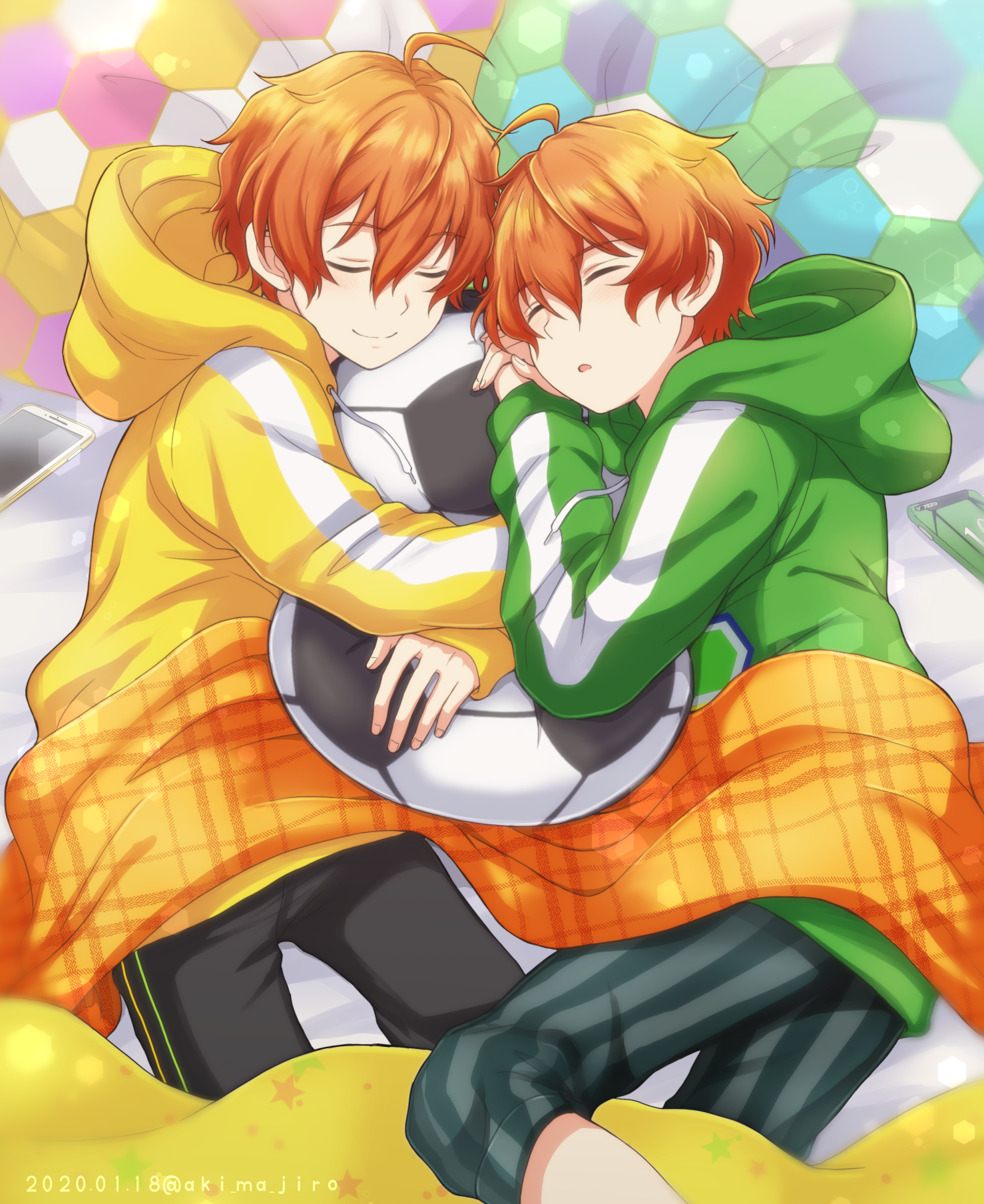 2020 2boys ahoge aki_ma_jiro aoi_kyosuke aoi_yusuke blanket brothers closed_eyes dated fingernails green_hoodie hair_between_eyes highres hood hoodie idolmaster idolmaster_side-m long_sleeves male_focus multiple_boys hugging_object parted_lips pillow pillow_hug siblings sleeping smile twins yellow_hoodie