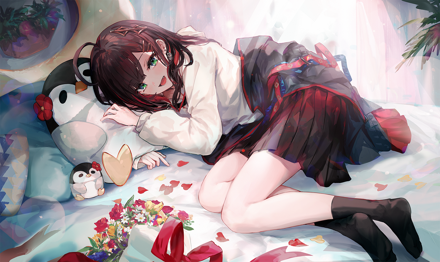 1girl ahoge arm_up bed_sheet black_hair black_skirt black_socks blue_flower bouquet commentary_request curtains earrings flower green_eyes hair_ornament hizuki_yui jewelry long_sleeves looking_at_viewer lying makihitsuji multicolored_hair neo-porte no_shoes official_art on_side petals pillow pleated_skirt puffy_long_sleeves puffy_sleeves red_flower red_hair red_rose rose shirt skirt socks soles solo streaked_hair stuffed_animal stuffed_penguin stuffed_toy virtual_youtuber white_flower white_shirt yellow_flower