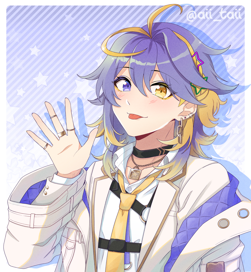 1boy aii_taii antenna_hair aster_arcadia black_choker blonde_hair chain chain_earrings choker commentary ear_piercing earrings english_commentary heterochromia jacket jewelry loose_necktie male_focus multicolored_hair necklace necktie nijisanji nijisanji_en off_shoulder piercing purple_eyes purple_hair ring solo star_(symbol) star_symbol_background striped_background tongue tongue_out twitter_username two-tone_hair upper_body virtual_youtuber white_jacket yellow_eyes yellow_necktie