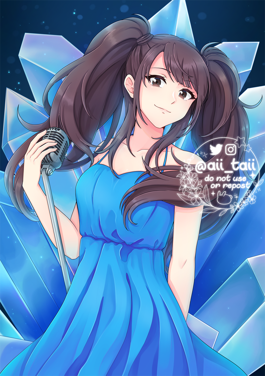 1girl aii_taii arm_behind_back blue_dress breasts brown_eyes brown_hair commentary commission crystal dress english_commentary highres kujikawa_rise medium_breasts microphone microphone_stand persona persona_4 sidelocks smile solo twintails twitter_username upper_body watermark
