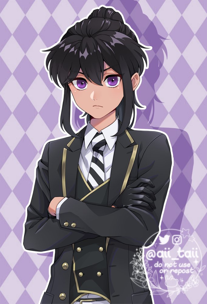 1other aii_taii androgynous argyle_background argyle_clothes black_gloves black_hair black_jacket commentary commission crossed_arms diagonal-striped_clothes diagonal-striped_necktie english_commentary frown gloves half_gloves jacket necktie original ponytail purple_eyes solo striped_clothes twitter_username upper_body vest watermark