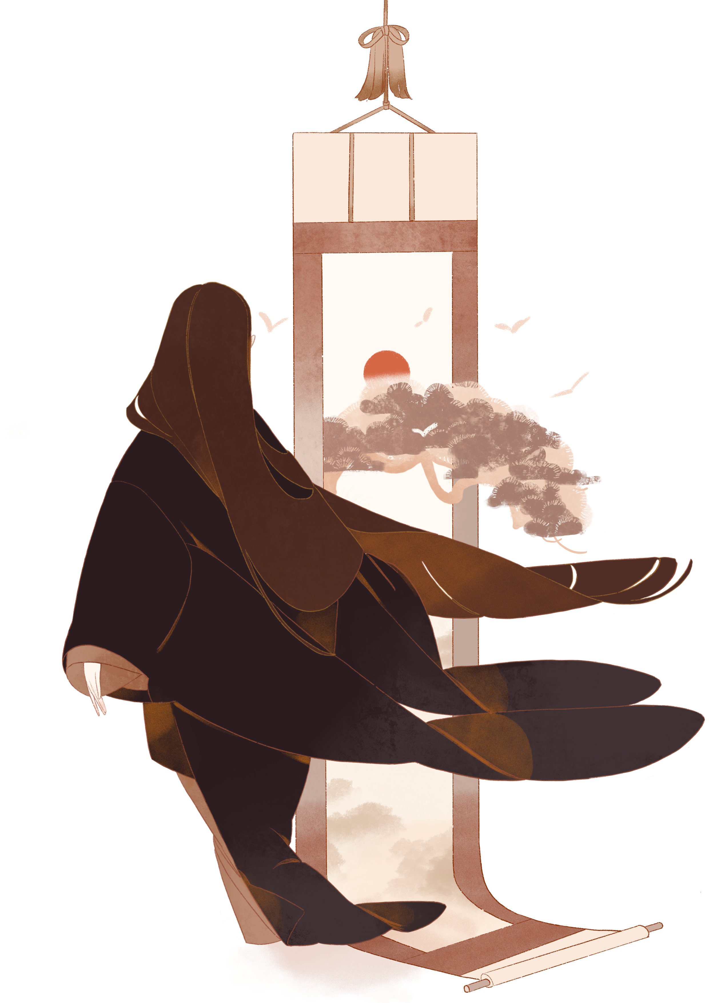 1girl absurdres animal bird black_coat black_hair branch brown_hair brown_kimono coat drawing_(object) facing_away floating_clothes floating_hair from_behind full_body hanging_scroll highres japanese_clothes kimono long_hair long_sleeves original scroll simple_background solo sun surie surreal through_medium through_screen very_long_hair white_background