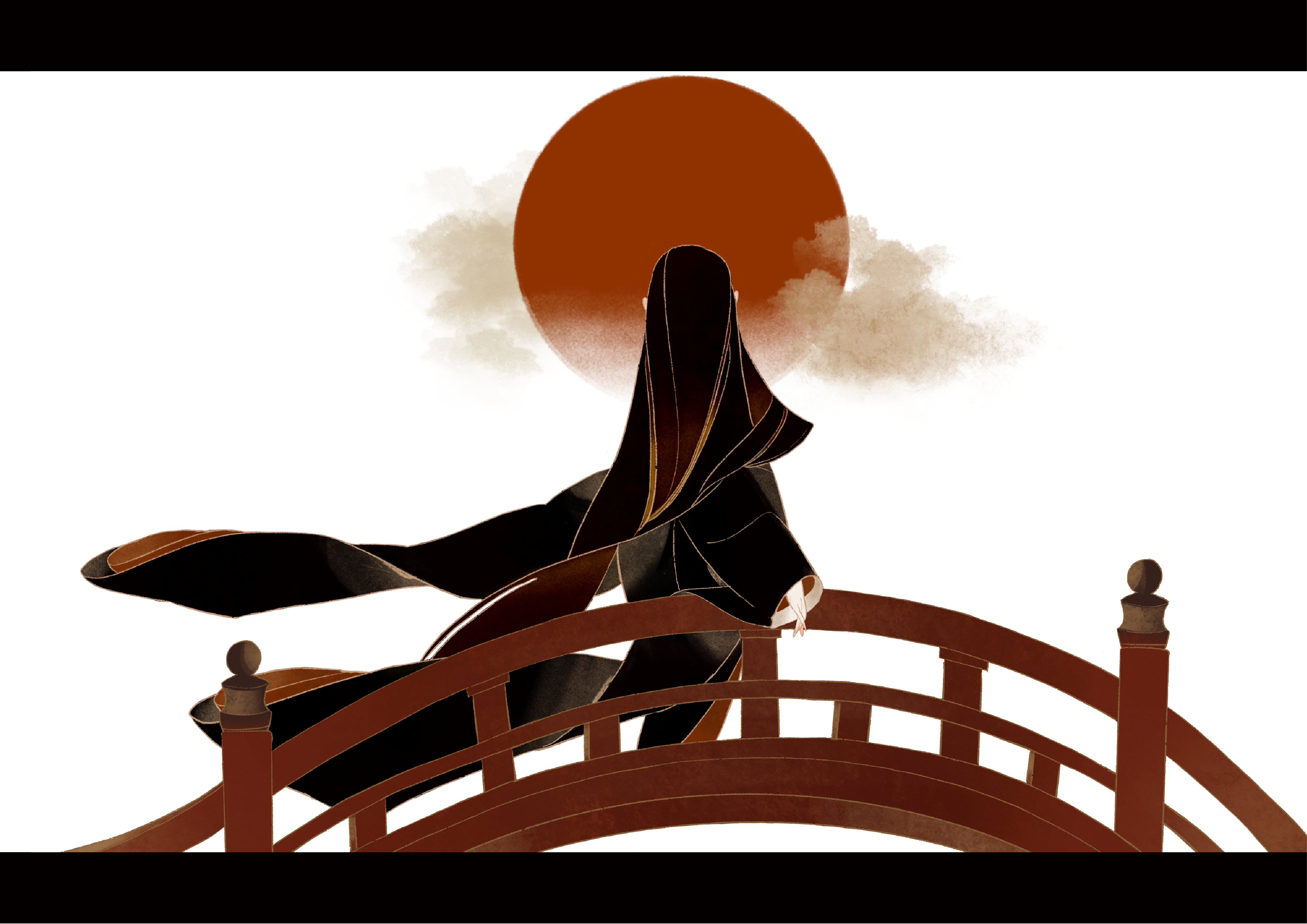 1girl absurdres black_hair bridge brown_hair cloud day facing_away floating_clothes floating_hair from_behind full_body highres japanese_clothes kimono letterboxed long_hair long_sleeves original outdoors simple_background sky solo standing sun surie very_long_hair white_background