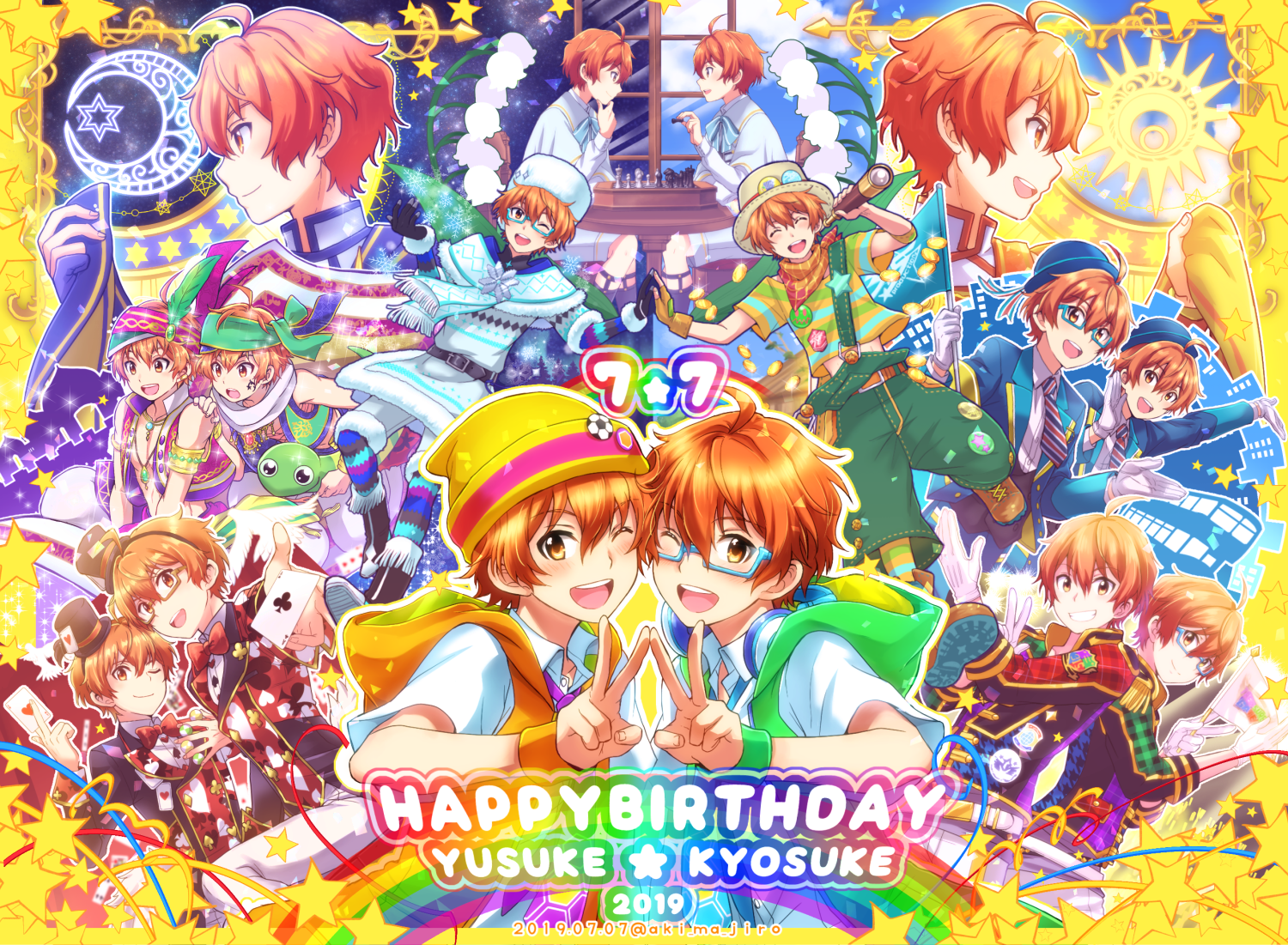 2019 2boys ahoge aki_ma_jiro aoi_kyosuke aoi_yusuke arabian_clothes armlet blue-framed_eyewear blush brothers card character_name chess_piece closed_eyes collared_shirt dated day fingerless_gloves fingernails glasses gloves green_hoodie happy_birthday hat headphones high_collar hood hoodie idolmaster idolmaster_side-m idolmaster_side-m_live_on_stage! jewelry long_sleeves male_focus midriff_peek mini_hat mini_top_hat multiple_boys multiple_persona necklace night official_alternate_costume one_eye_closed orange_eyes orange_hair shirt shorts siblings single_glove star_(symbol) striped_clothes striped_shirt teeth top_hat twins upper_teeth_only v white_gloves white_shorts world_tre@sure_(idolmaster) wristband yellow_hoodie