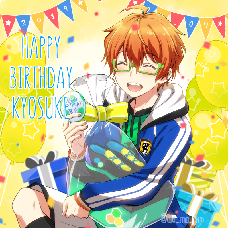 1boy ahoge aki_ma_jiro aoi_kyosuke balloon blush character_name closed_eyes fingernails gift glasses green-framed_eyewear green_shirt hair_between_eyes happy_birthday hood hoodie idolmaster idolmaster_side-m long_sleeves male_focus open_mouth orange_hair shirt shoes shorts teeth upper_teeth_only white_hoodie white_shorts