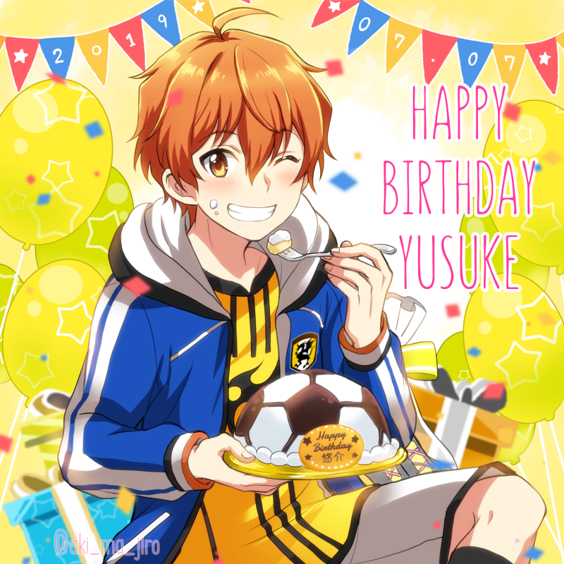 1boy ahoge aki_ma_jiro aoi_yusuke balloon cake confetti fingernails food fork gift hair_between_eyes happy_birthday holding holding_fork hood hoodie idolmaster idolmaster_side-m long_sleeves male_focus one_eye_closed orange_eyes orange_hair shirt shorts smile star_(symbol) string_of_flags teeth white_hoodie white_shorts yellow_shirt